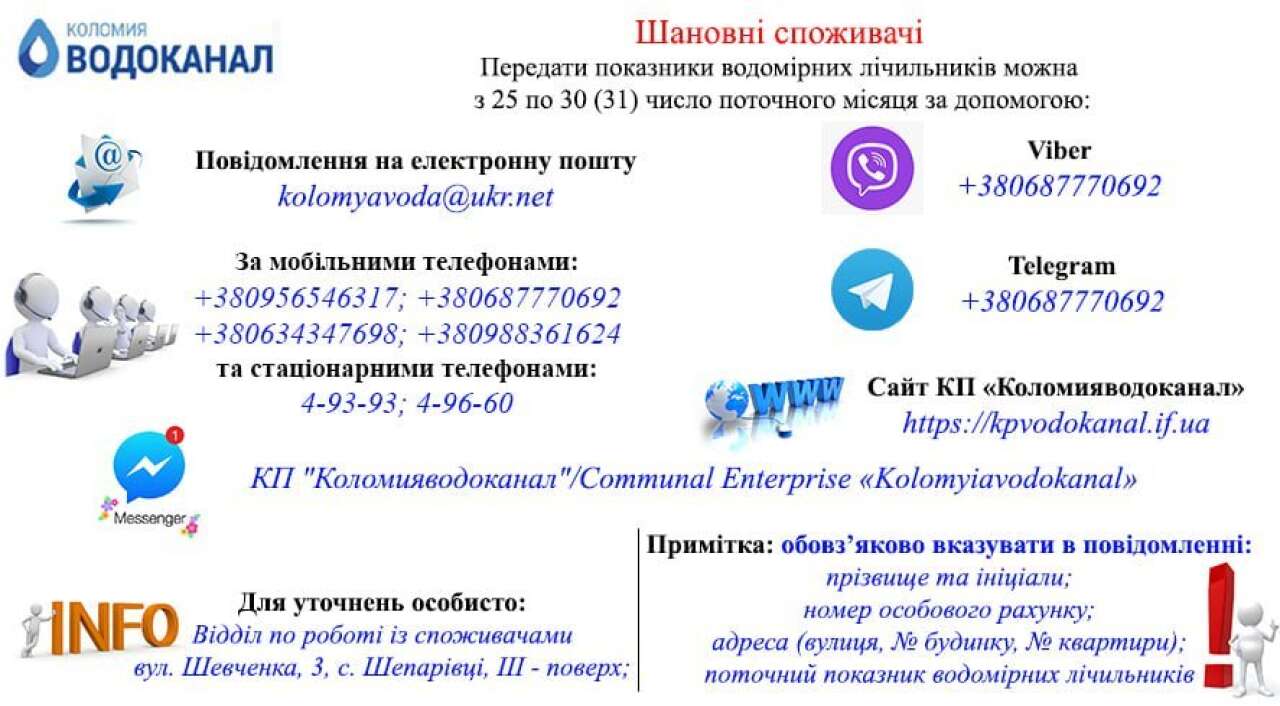Якщо не вдається додзвонитись у відділ по роботі зі споживачами КП «Коломияводоканал», подати свій показник і дізнатися про стан особового рахунку можливо, написавши повідомлення на сторінці у фейсбук КП "Коломияводоканал" https://www.facebook.com/Kolomyiavodokanal із зазначенням особистих даних.