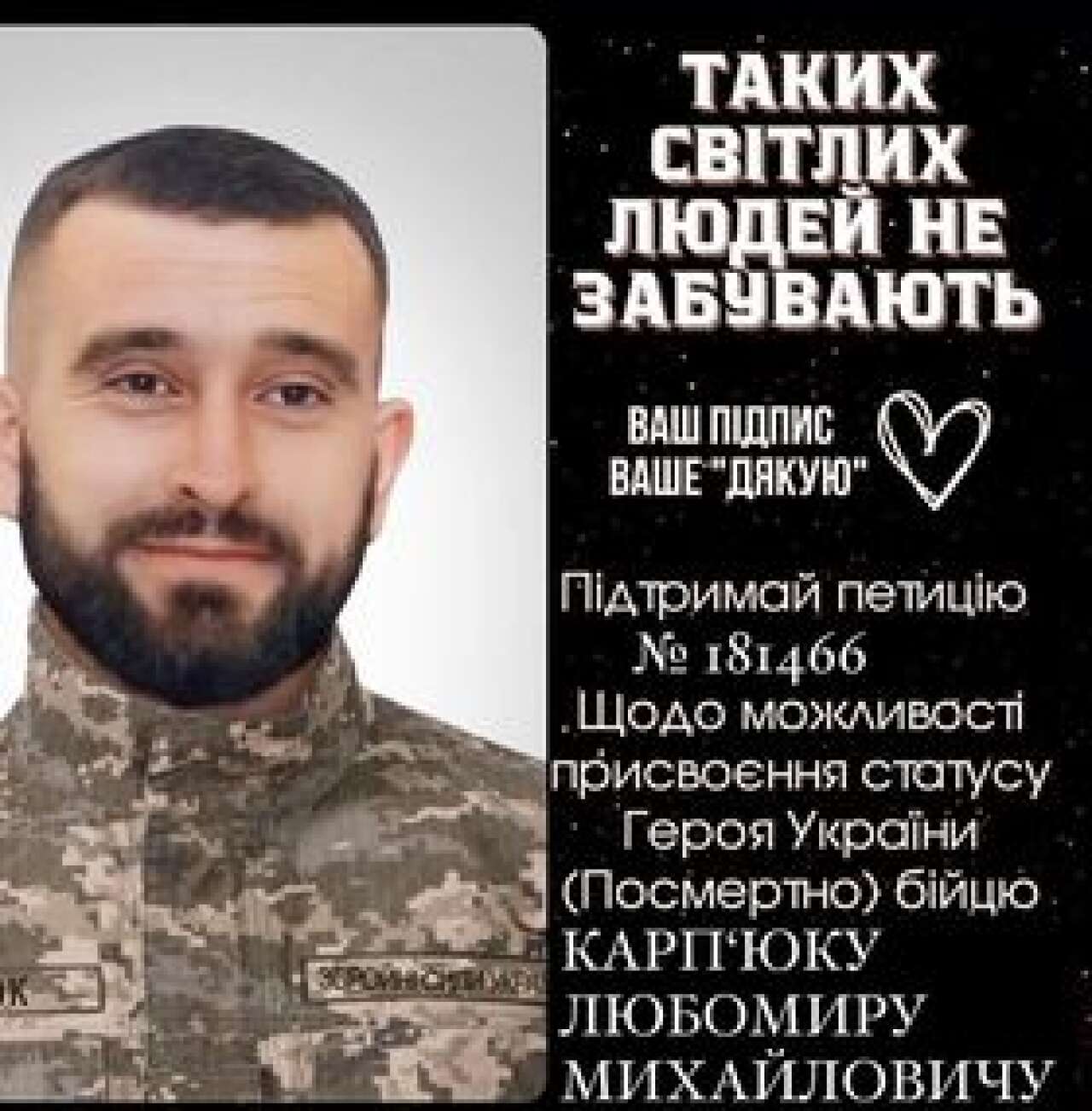 На сайті президента зареєстровано петицію про присвоєння полеглому захиснику Любомиру Карп'юку звання Героя України. Мешканців Коломийщини просять підтримати петицію. Зробити це можна перейшовши за посиланням.