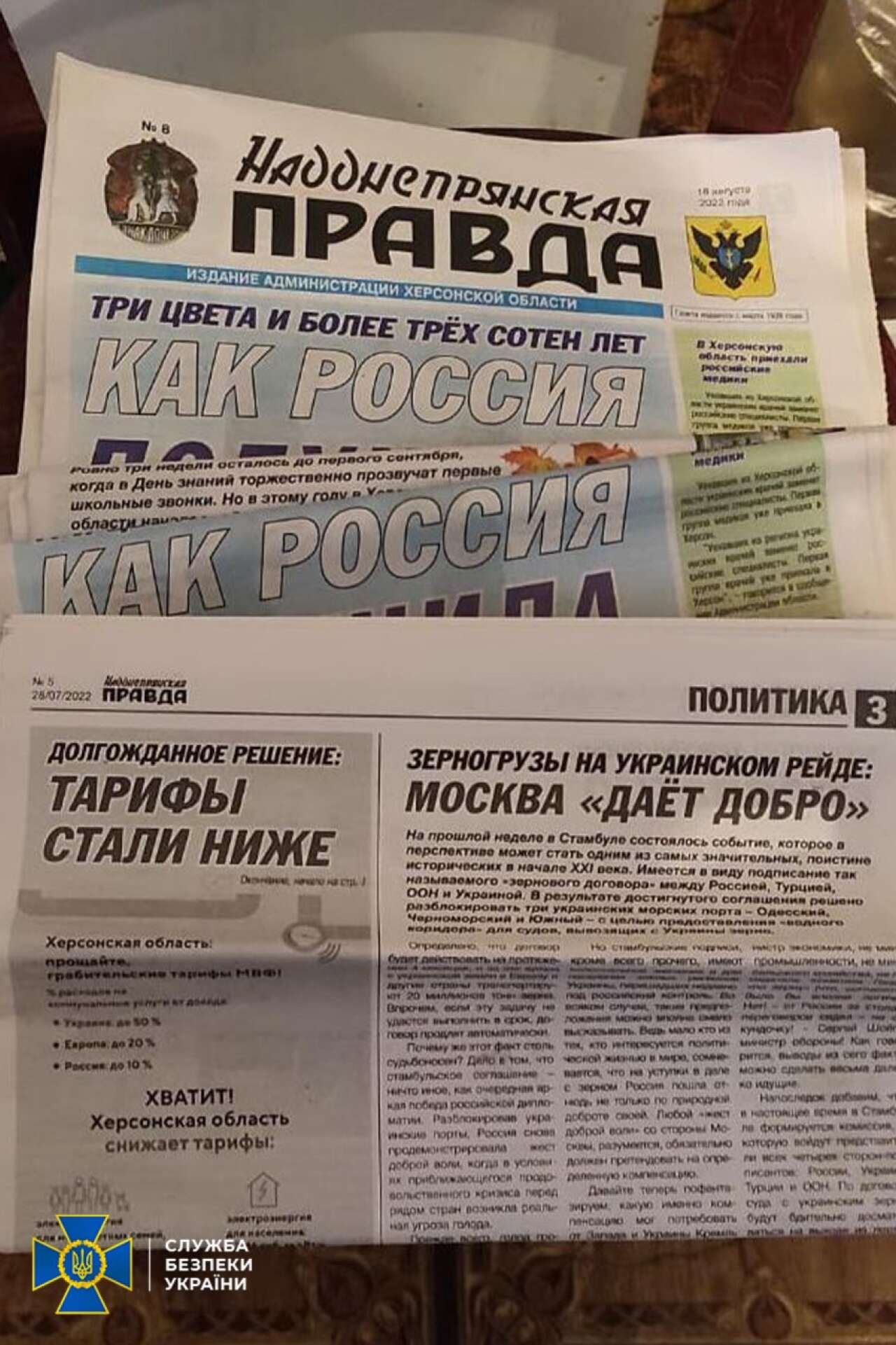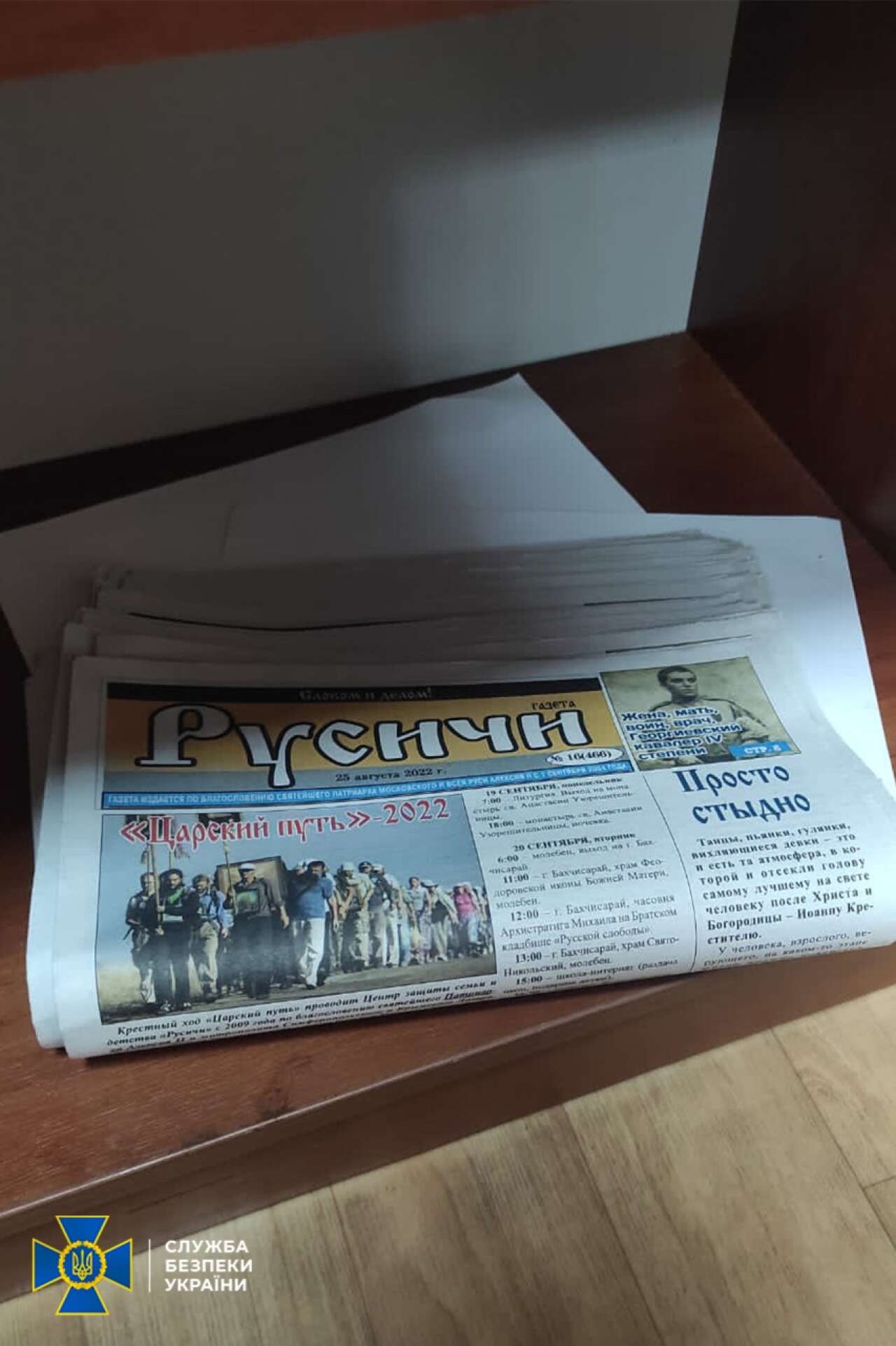 У приміщеннях Херсонської єпархії було знайдено рушницю без відповідних дозвільних документів, прапор і золотий герб росії.