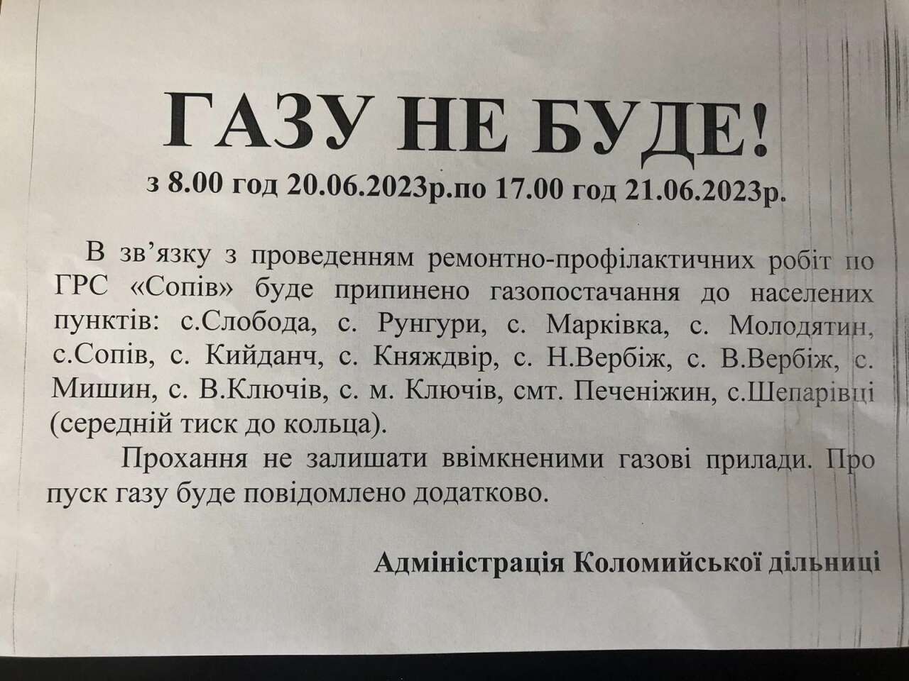 У зв'язку з ремонтно-профілактичними роботами 20 - 21 червня не буде газу у наступних населених пунктах: