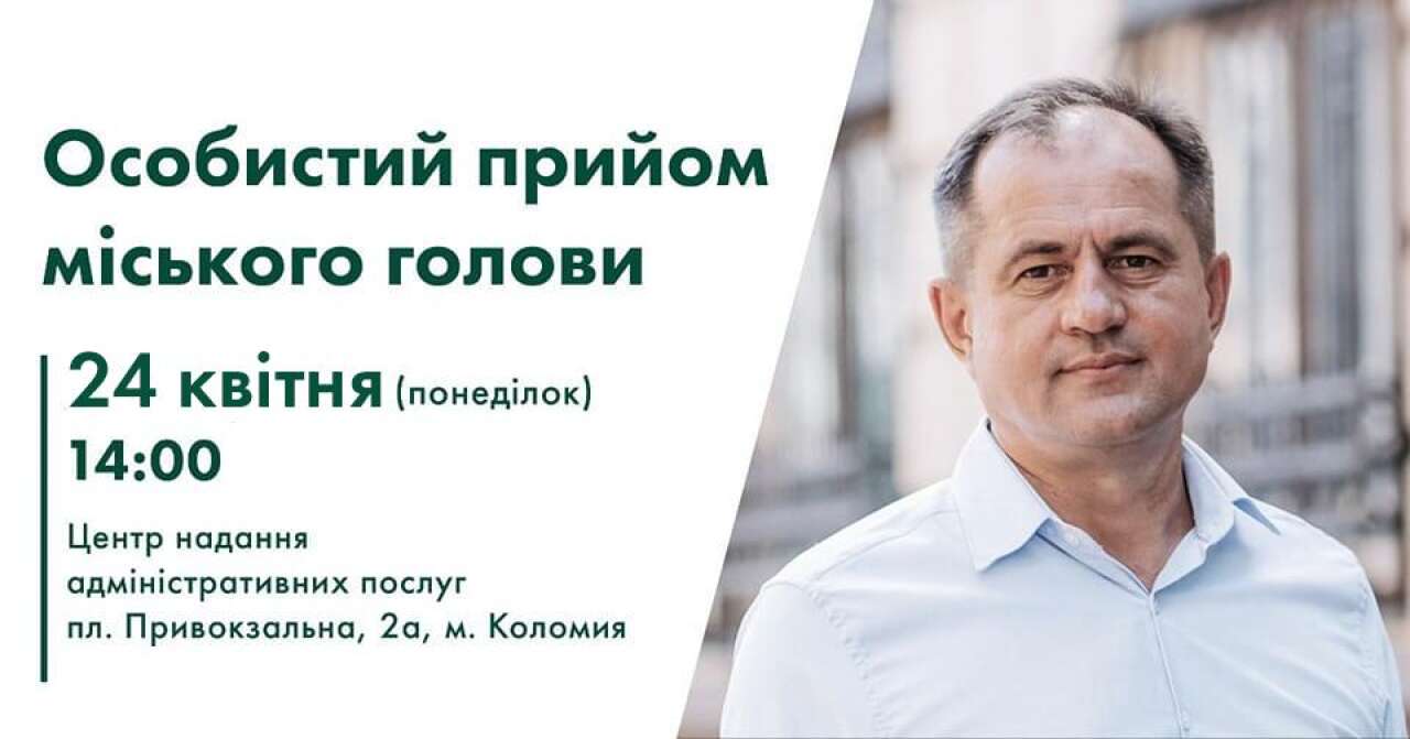 24 квітня о 14 годині у приміщенні Коломийського ЦНАПу (пл. Привокзальна, 2а/1, І поверх) відбудеться прийом громадян з особистих питань у міського голови Богдана Станіславського.