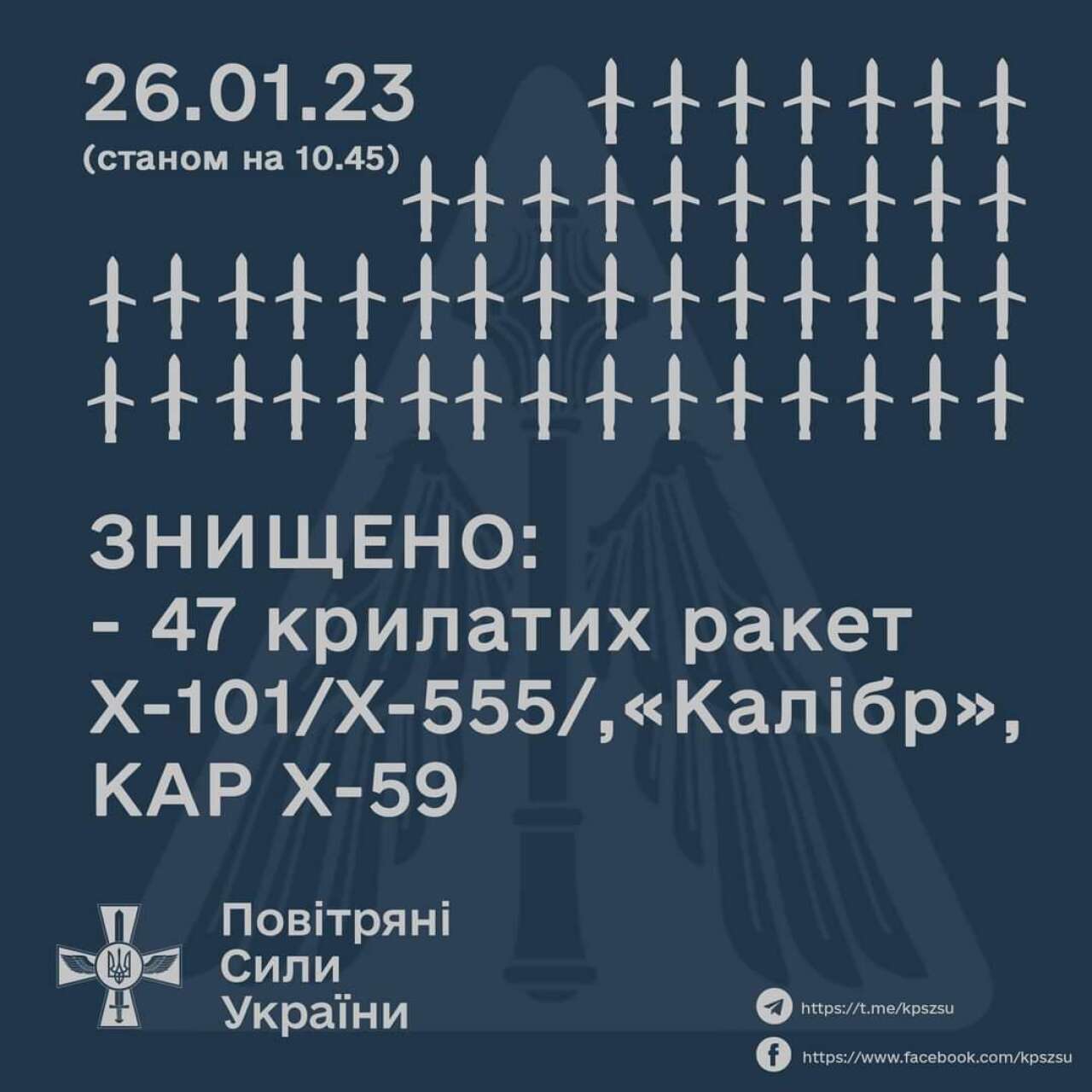 Силами та засобами Повітряних Сил ЗС України у взаємодії з підрозділами інших складових Сил оборони знищено 47 крилатих та керованих авіаційних ракет. Крім того, три із чотирьох керованих авіаційних ракет Х-59 не досягли своїх цілей.