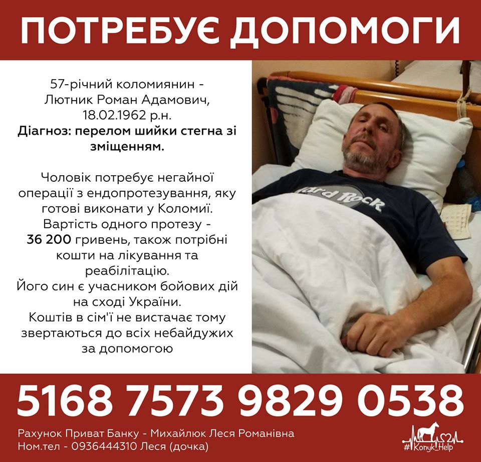 Потребує допомоги 57-річний коломиянин Лютник Роман Адамович,18.02.1962 р. н. Діагноз: перелом шийки стегна зі зміщенням.