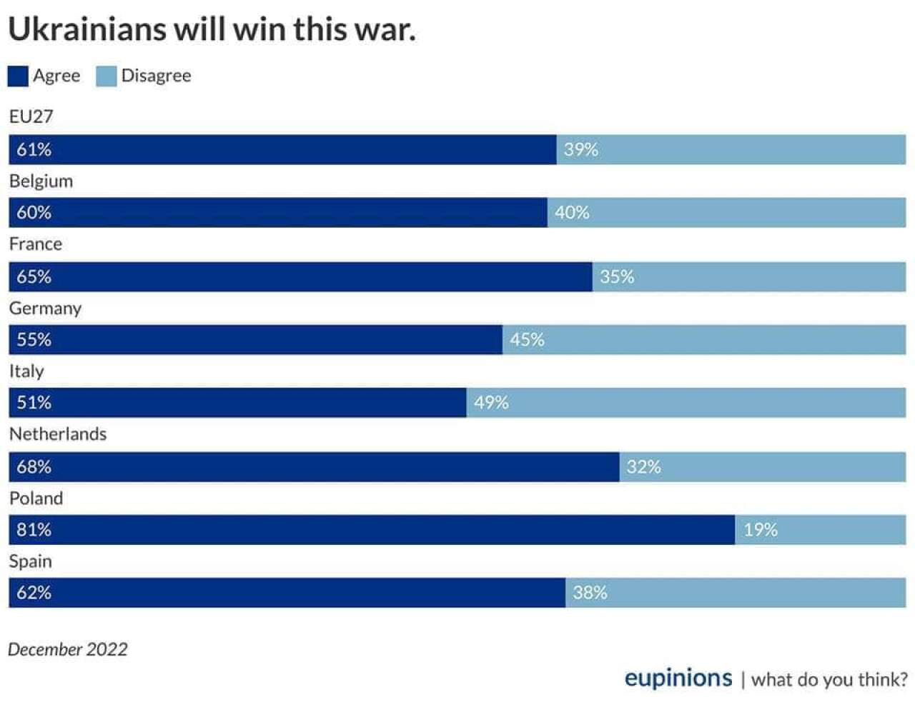 Опитування, проведене Eupinions, також свідчить, що 68% мешканців ЄС розглядають вторгнення в Україну, як напад на Європу в цілому.