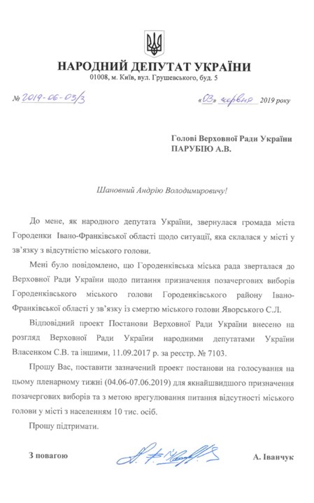 Народний депутат України Андрій Іванчук звернувся з листом-клопотанням до Голови Верховної Ради Андрія Парубія та голови Комітету ВР з питань державного будівництва Сергія Власенка щодо ситуації, яка склалася у Городенці у зв'язку з відсутністю міського голови.