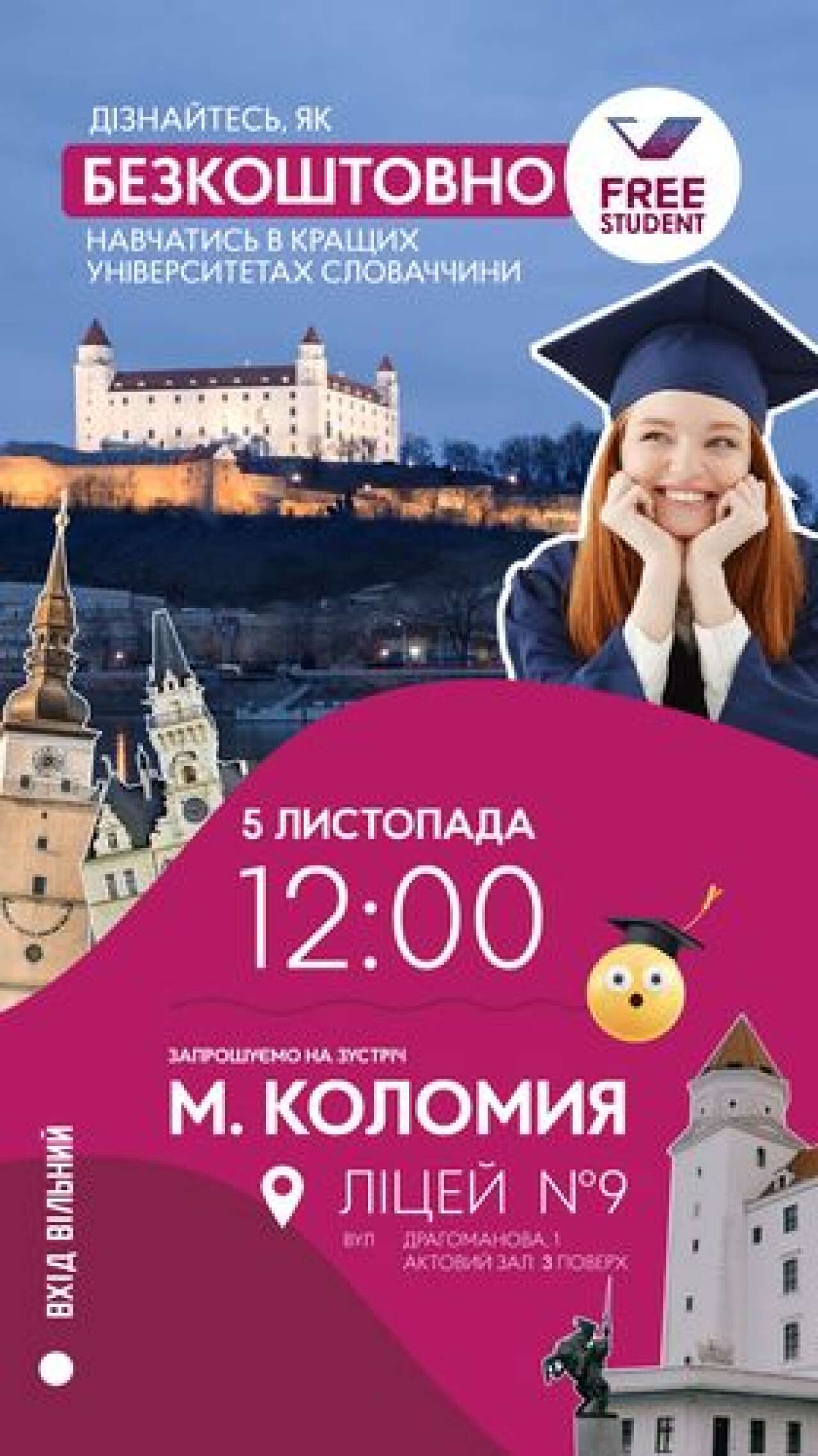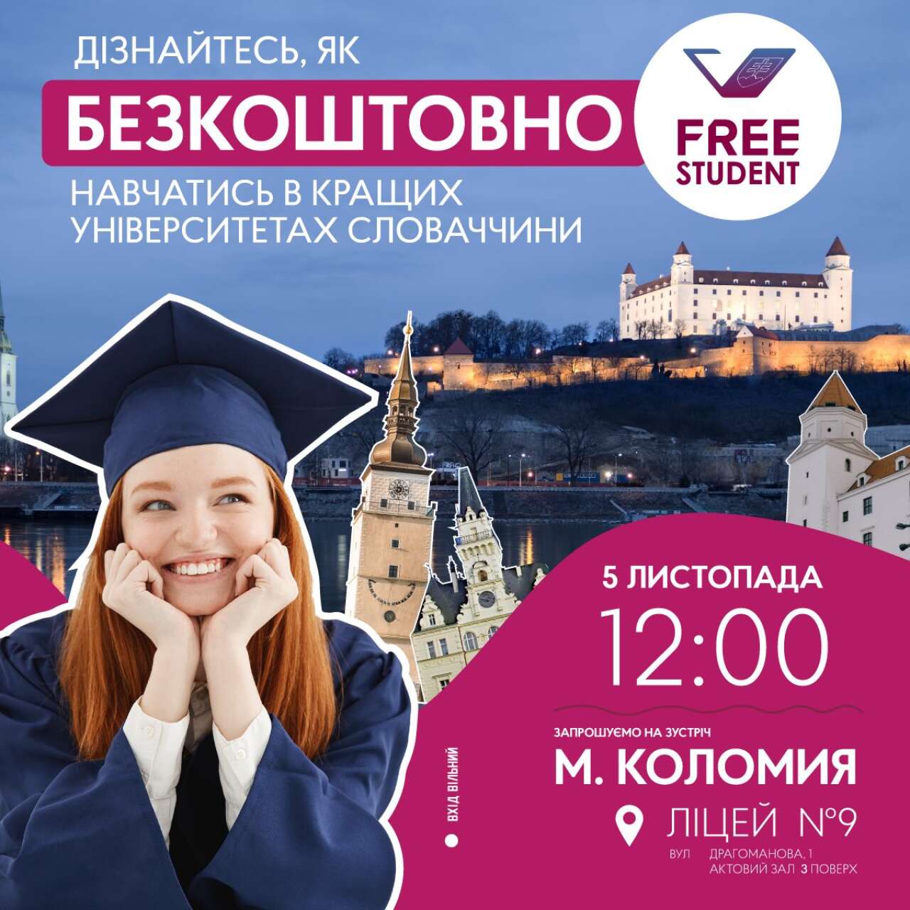Погодьтеся, пропозиція непересічна й цікава! Тож не пропустіть – 05 листопада о 12 год в м.Коломия відбудеться детальне ознайомлення з умовами вступу до державних університетів Словаччини, перевагами програми Free Student і реальними можливостями, які для вас відкриються.