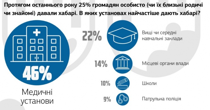 При цьому більшість респондентів - 46%, які зізналися в передачі грошей, заявили, що платили представникам медичних установ.