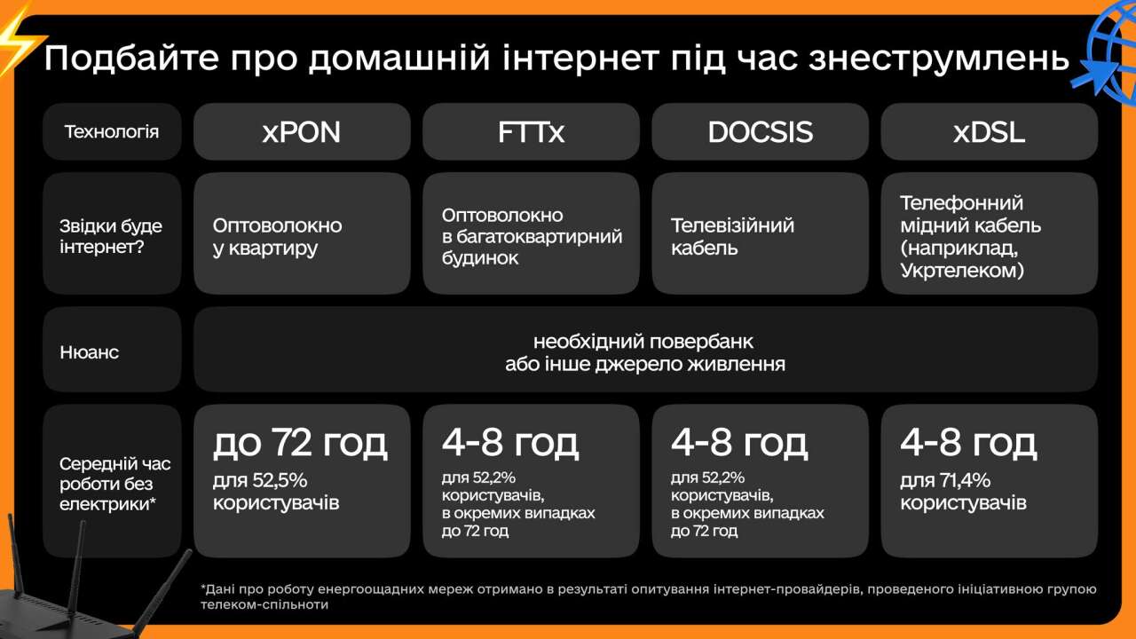 Дізналися в провайдерів про найефективніші способи, що допоможуть забезпечити інтернет під час відключень. Він підійде українцям з різним типом інтернету в будинку та дасть змогу залишатися на звʼязку від 4 до 72 годин.