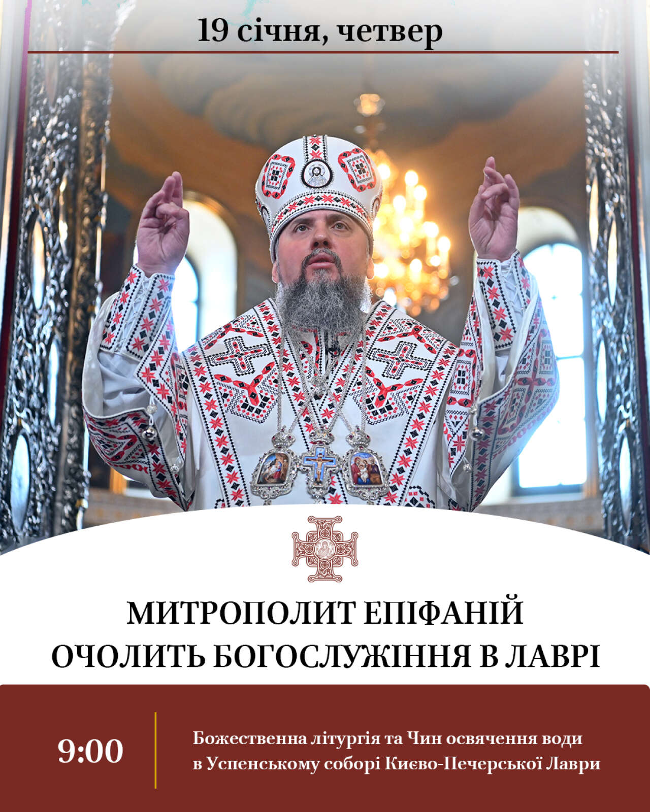 "Запрошуємо всіх вірних долучитися до святкової Божественної літургії, яка розпочнеться 19 січня, у четвер, в головному соборі Лаври о 9:00. Священноархімандрит Свято-Успенської Києво-Печерської лаври Блаженнійший Митрополит Київський і всієї України Епіфаній після Божественної літургії звершить також і Чин великого освячення води. Присутні зможуть почерпнути освяченої води у святині українського народу – соборному храмі Успенської Лаври.