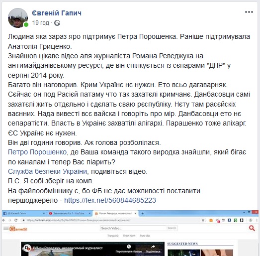 Знайшов цікаве відео аля журналіста Романа Реведжука на антимайданівському ресурсі, де він спілкується із сєпарами "ДНР" у серпні 2014 року.