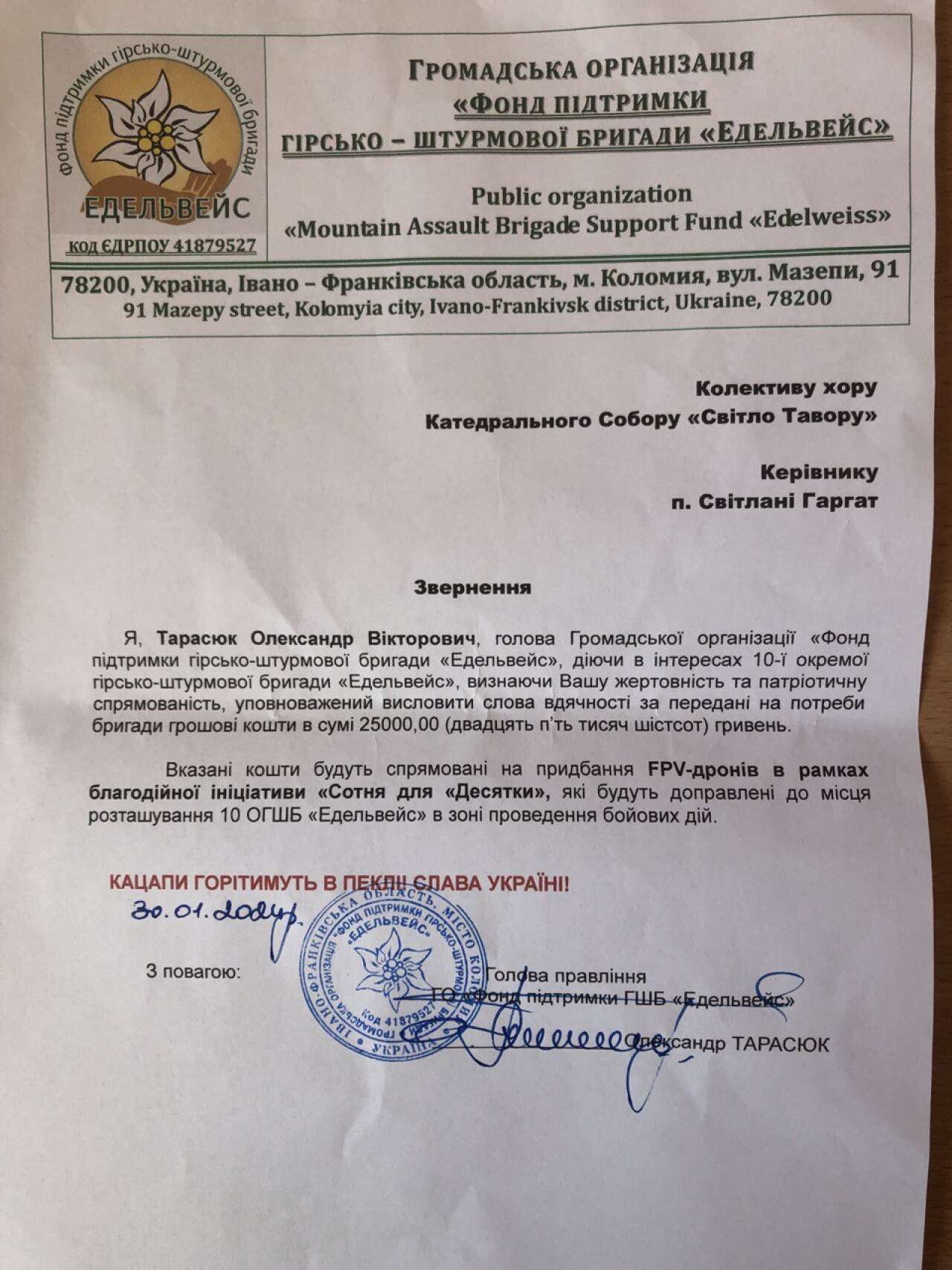 Хор «Світло Тавору» передав кошти з ювілейного концерту у Фонд підтримки 10-ої гірсько-штурмової бригади «Елельвейс»