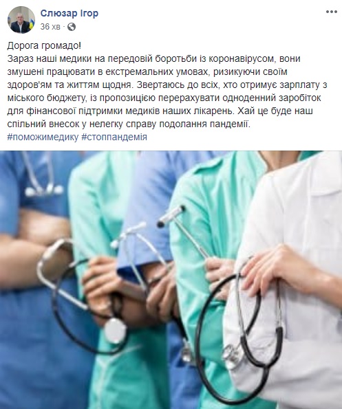 Зараз наші медики на передовій боротьби із коронавірусом, вони змушені працювати в екстремальних умовах, ризикуючи своїм здоров'ям та життям щодня. Звертаюсь до всіх, хто отримує зарплату з міського бюджету, із пропозицією перерахувати одноденний заробіток для фінансової підтримки медиків наших лікарень. Хай це буде наш спільний внесок у нелегку справу подолання пандемії", - написав мер.