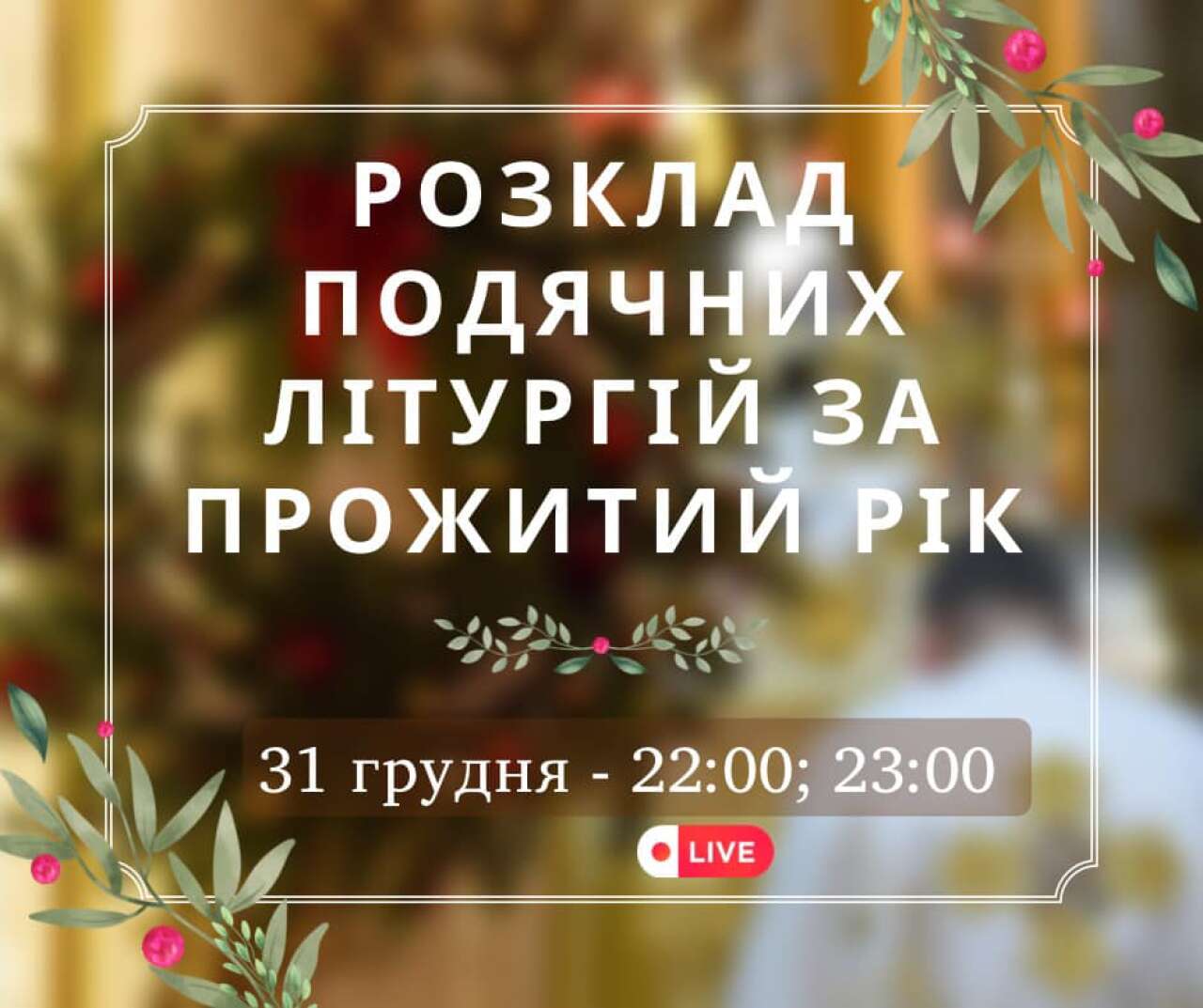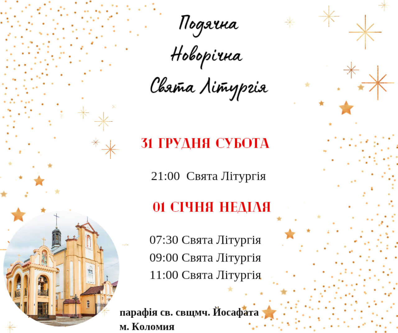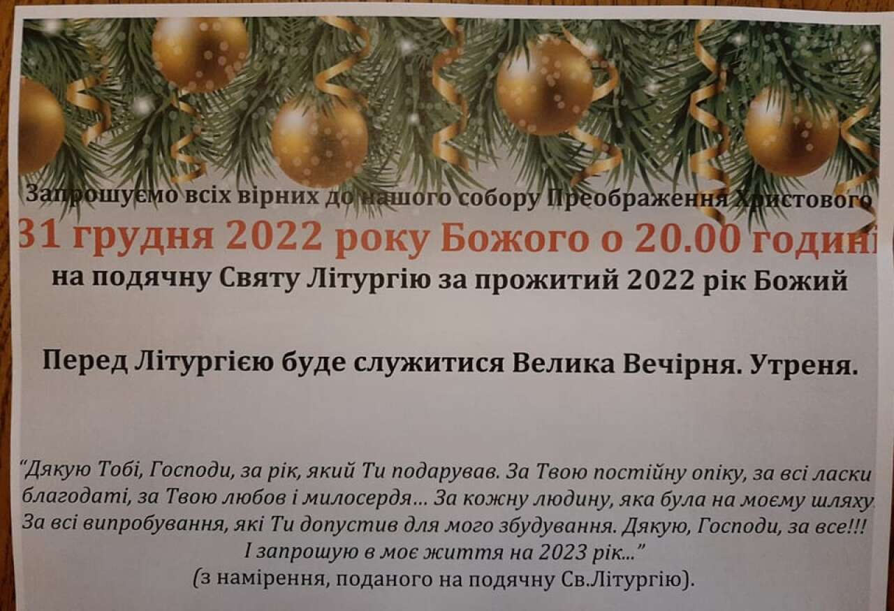 31 грудня о 21.00 год. - Подячна Свята Літургія за прожитий рік