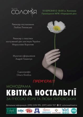 Театр "СОЛОМІЯ" запрошує всіх коломиян на презентацію  монодрами "Квітка ностальгії" за п’єсою Ігора та Люби ЛИПОВСЬКИХ. Даний захід відбудеться  10 березня на сцені МПК "Народний дім", інформує Дзеркало медіа. Початок о 18.00 Квитки в касі МПК "Народний дім". Замовлення за тел.: (095) 2194 991; (097) 6104 707 Постановча група режисер-постановник – Любов ЛИПОВСЬКА режисер з пластики – засл. діяч мистецтв України Мирослава ВОРОТНЯК музичне оформлення – Андрій ТОМЕНЧУК сценографія – Ольга ХІЛОБОК асистент режисера - Мар’яна КОДІНА-ІВАНОВИЧ В ролях: Мар’яна КОДІНА-ІВАНОВИЧ, засл. працівник культури України Іван Арсенич, Андрій ТОМЕНЧУК