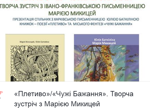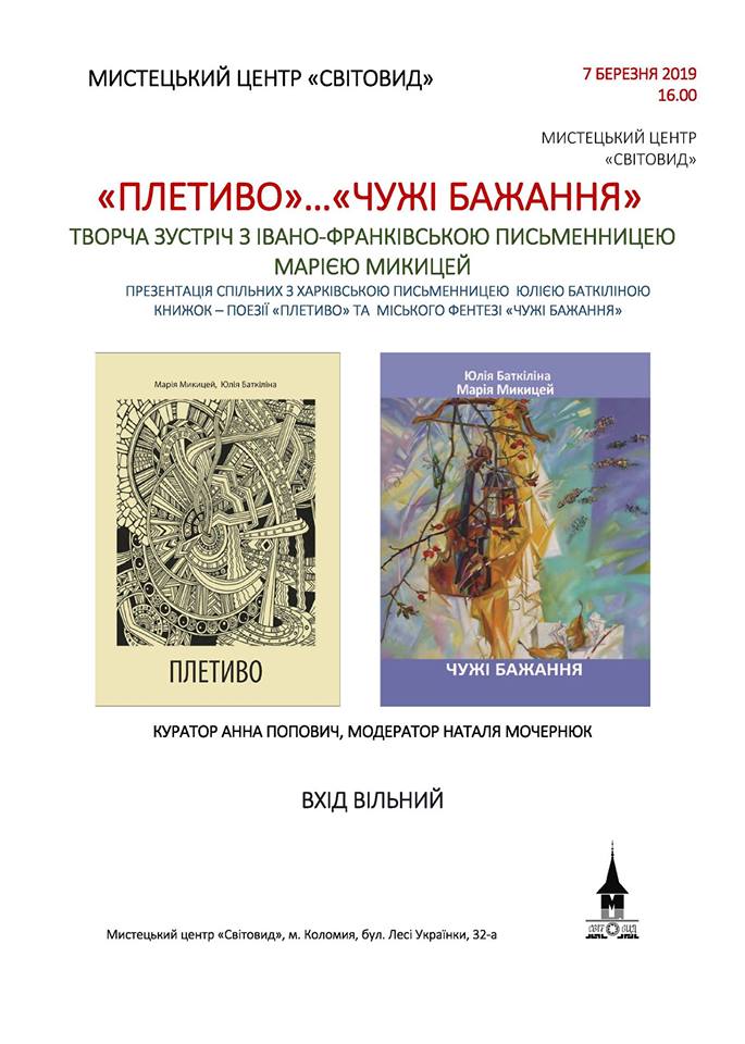 Коломиян запрошують на творчу зустріч з івано-франківською письменницею Марією Микицей на якій відбудеться презентація спільних з харківської письменницею Юлєю Баткіліної книжок "Плетиво" та міського фентезі "Чужі бажання" .