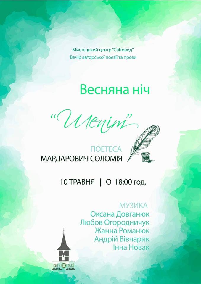 10 травня у Мистецькому центрі “Світовид” відбудеться вечір авторської поезії та прози Соломії Мардарович “Весняна ніч. Шепіт”.