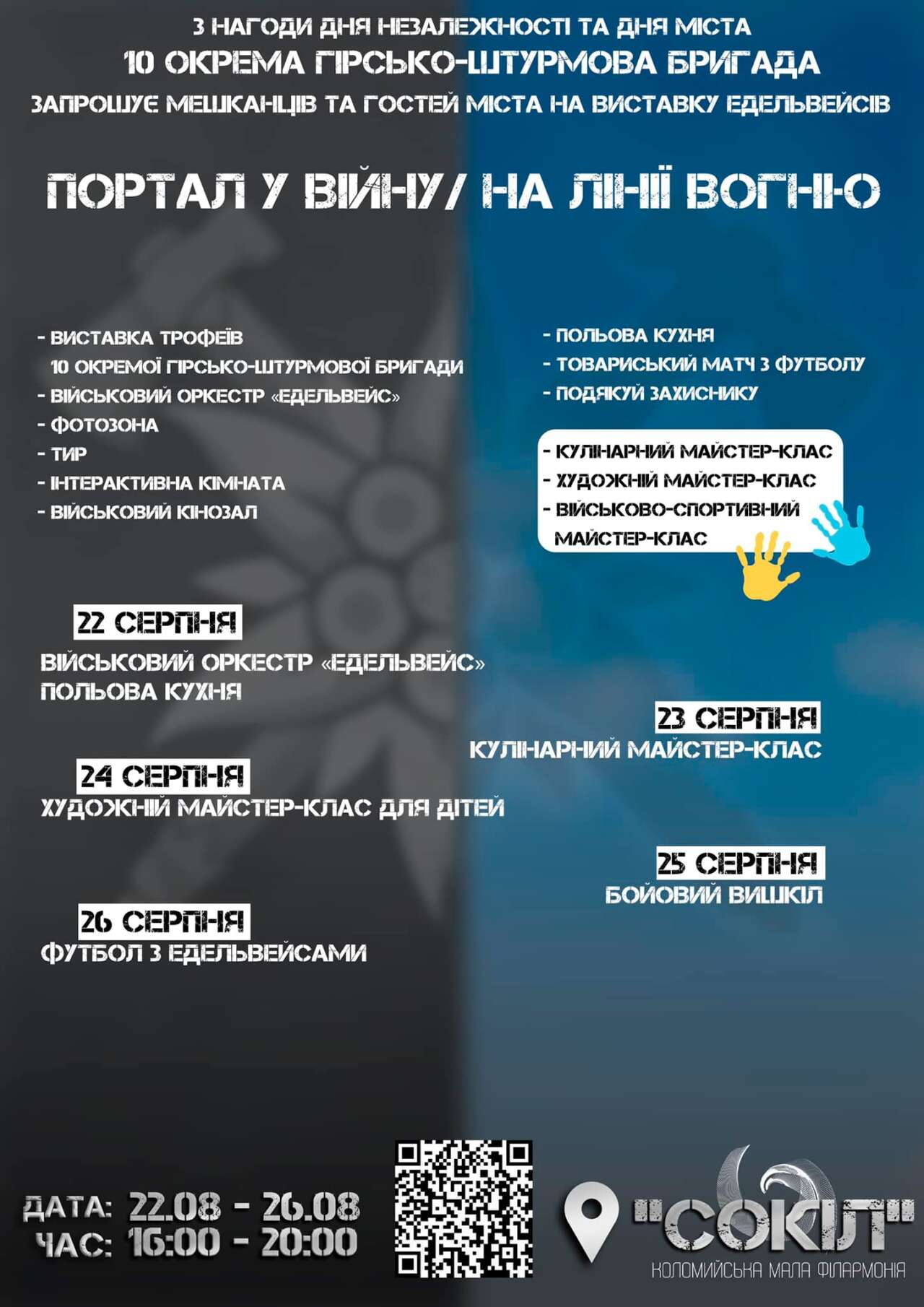 З нагоди Дня міста та Дня Незалежності України легендарні "Едельвейси" запрошують коломиян та всіх гостей Коломиї відвідати виставку 10-ої окремої гірсько-штурмової бригади «Портал у війну/На лінії вогню».