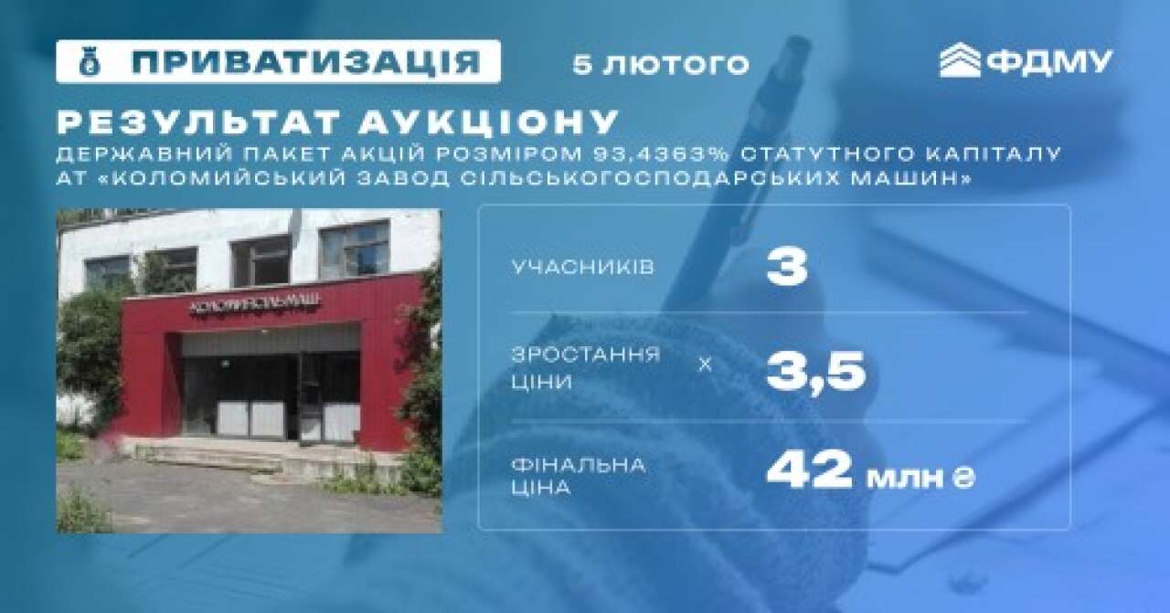 Фонд державного майна України провів онлайн-аукціон з приватизації державного пакету акцій АТ «Коломийський завод сільськогосподарських машин» (93,4363% статутного капіталу) на Івано‑Франківщині. Торги відбулися на платформі Прозорро.Продажі за участю трьох компаній: ПП «ВЕСТХІМ», ТОВ «МВА Девелопмент Групп» та ТОВ «Піроліз котло-монтаж».