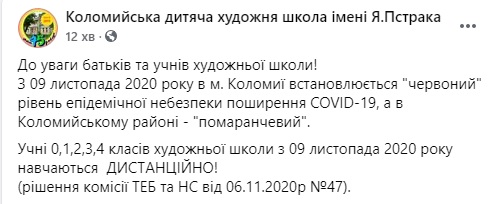 З 9 листопада учні 0, 1, 2, 3, 4 класів Коломийської дитячої художньої школи імені Я. Пстрака навчаються дистанційно.