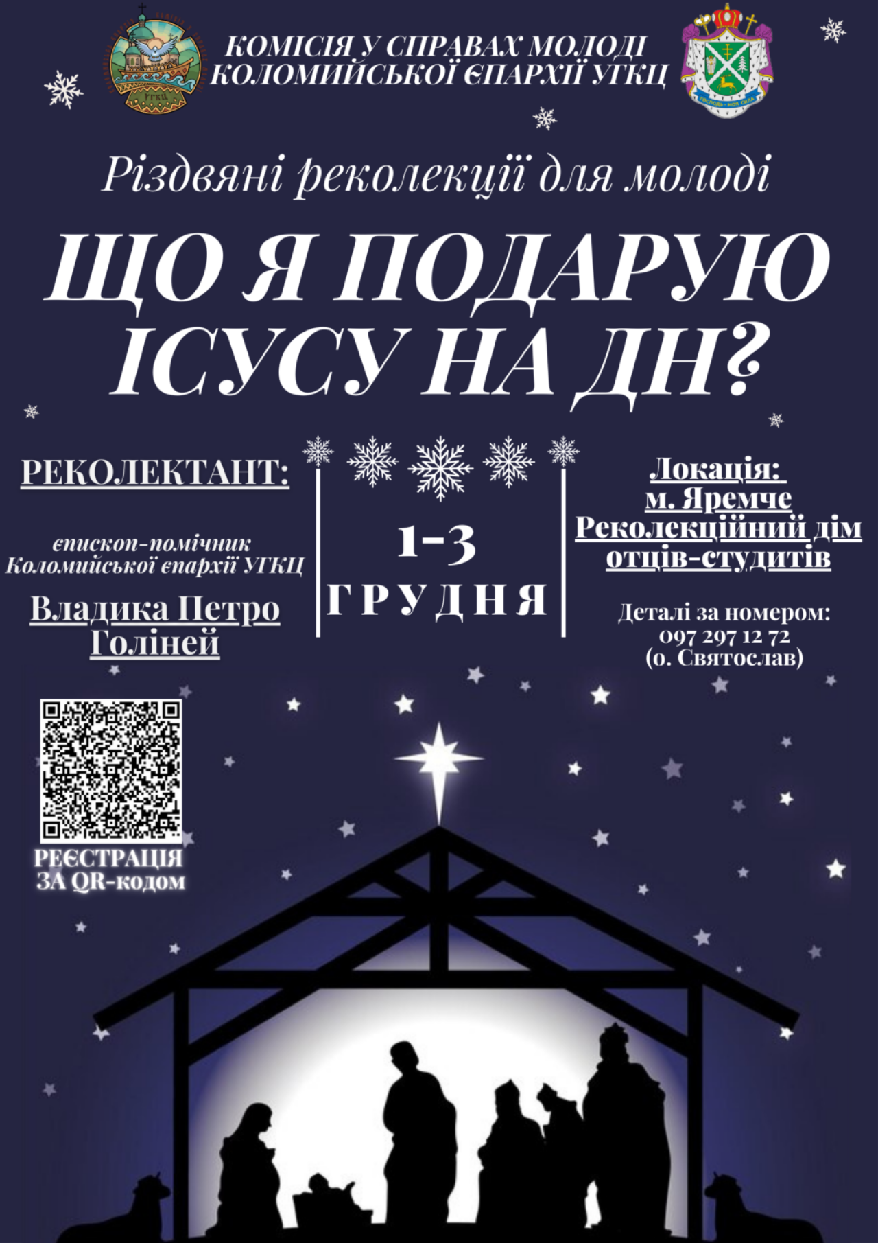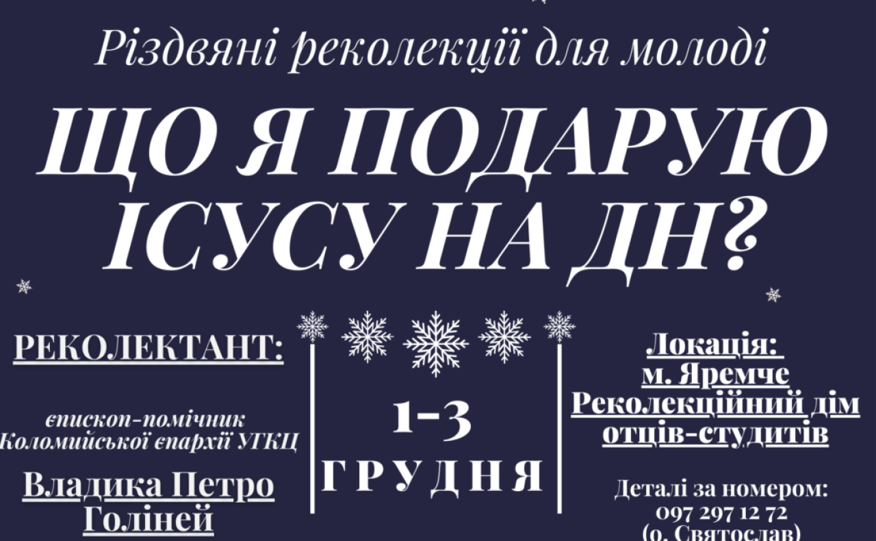 Комісія у справах молоді Коломийської єпархії УГКЦ запрошує молодь 16-25 років на різдвяні реколекції, котрі відбудуться в м. Яремче (Реколекційний дім отців студитів) з 1 по 3 грудня!