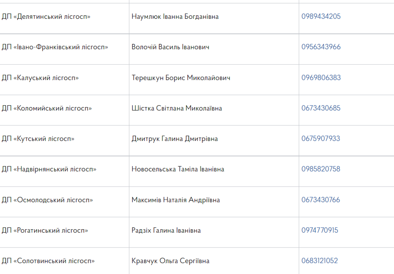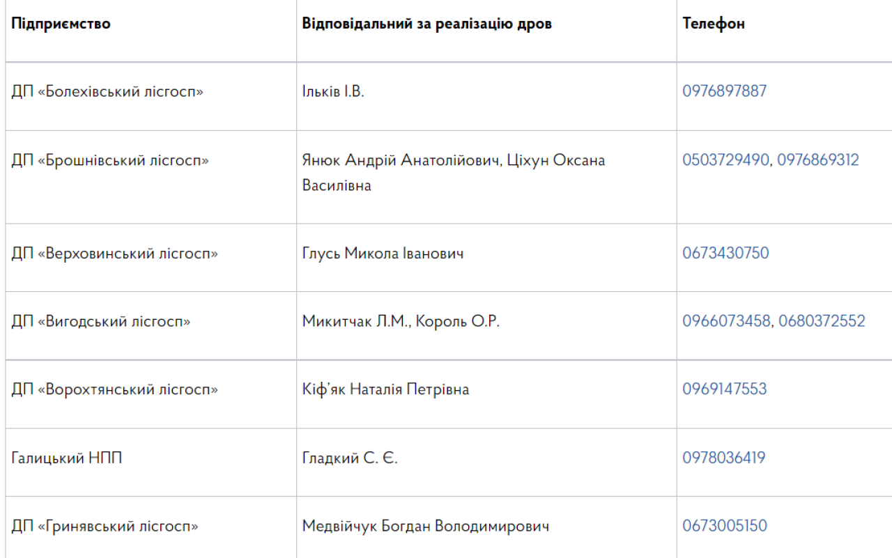 Контактні дані осіб відповідальних за реалізацію дров паливних для населення та соціальної сфери на державних лісогосподарських підприємствах Івано-Франківського обласного управління лісового та мисливського господарства.