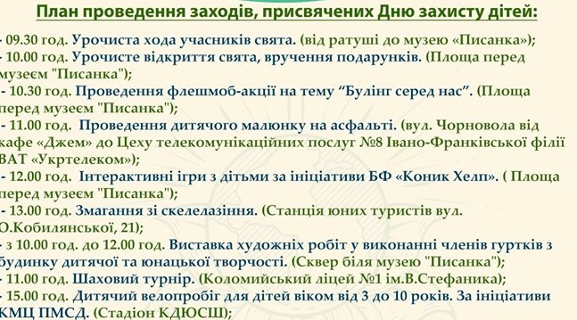 1 червня, у День захисту дітей, у Коломиї запланована низка заходів.