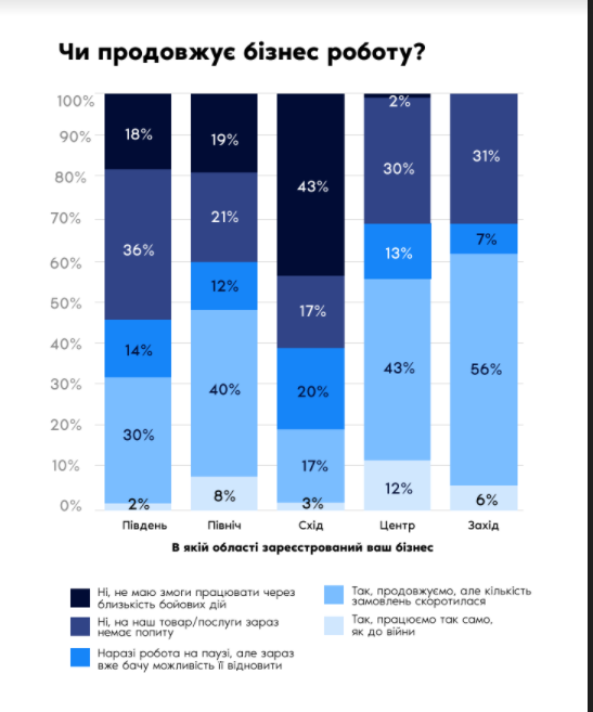 - Лише 5% українських підприємств повністю зупинили свою діяльність (на заході країни жодного), або переключились на волонтерство.