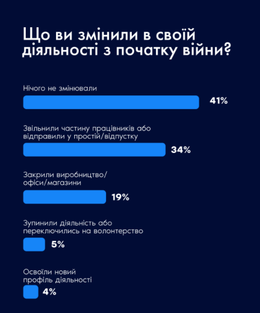 - 41% нічого не змінили у своїй діяльності з початку війни, а більше третини підприємств (34%) скоротили зарплату, звільнили частину працівників або відправили їх у відпустку. Ще 19% довелося закрити офіси, магазини чи виробництва.