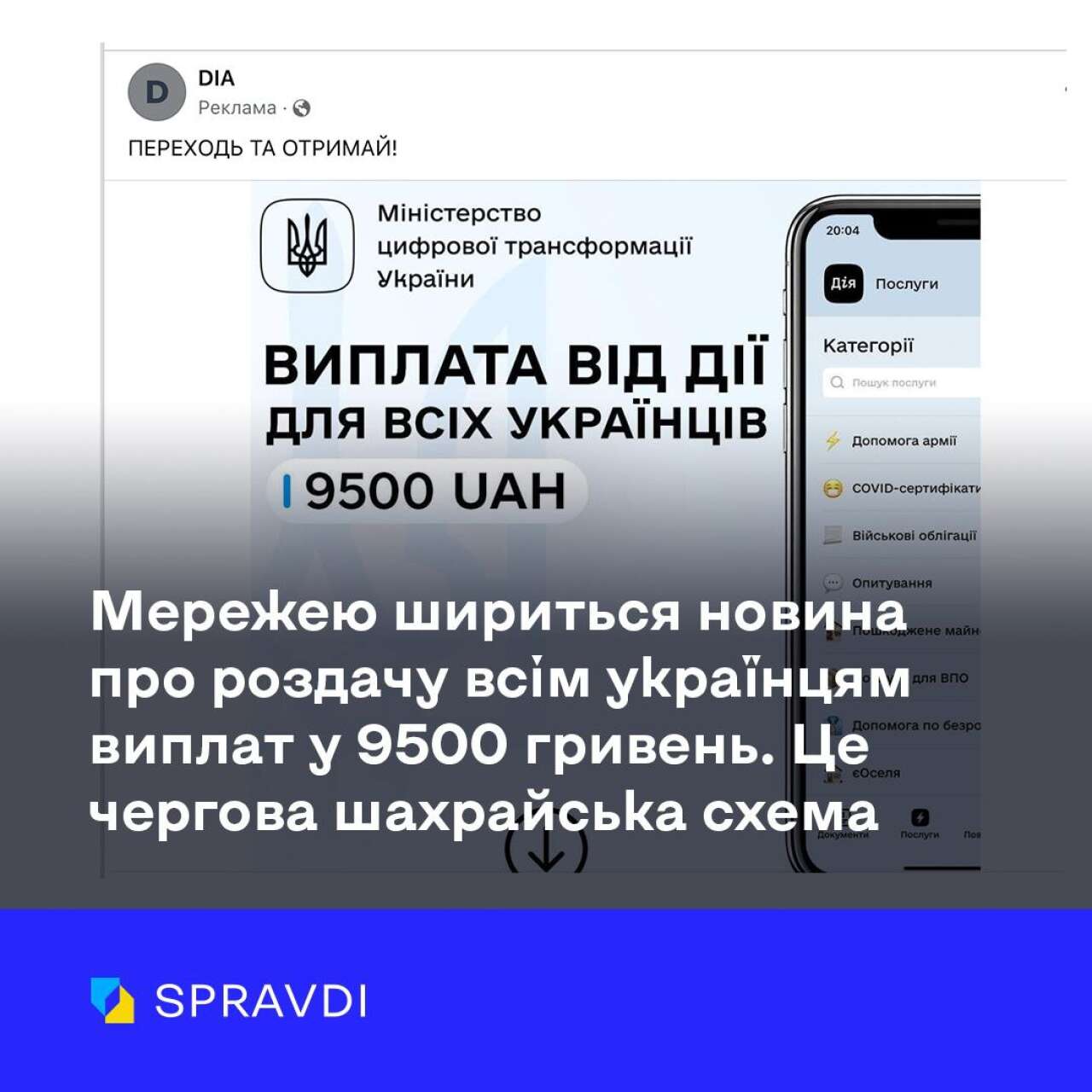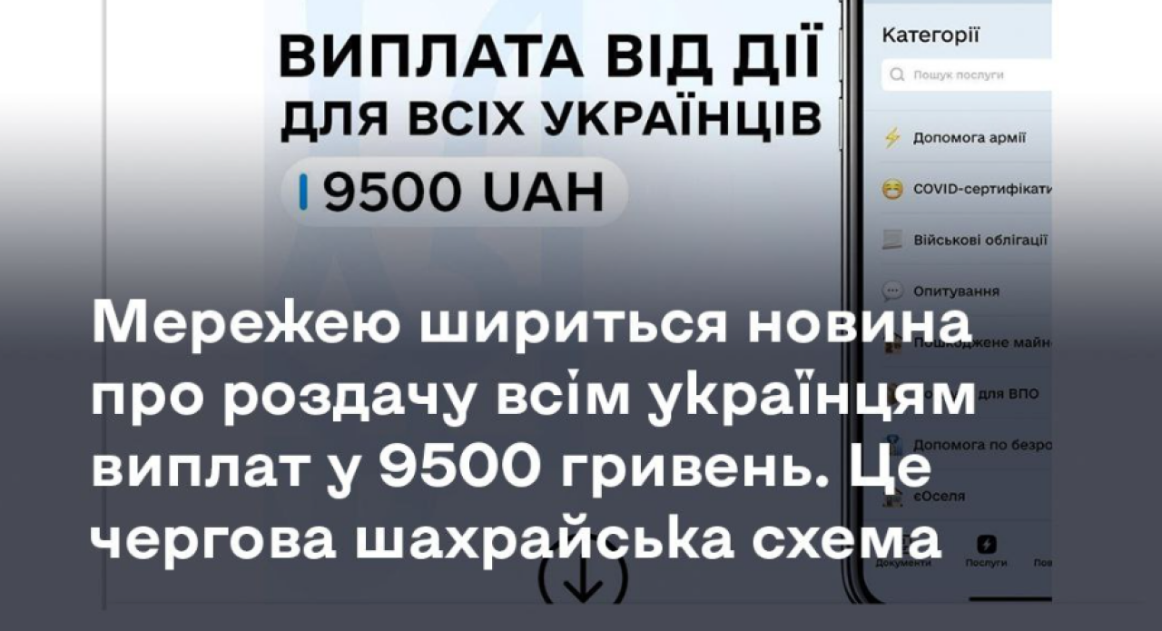 Цього разу нечисті на руку «добродії» створили фейкову сторінку українського порталу державних послуг і назвали його DIA (коректна офіційна назва «Дія»). У графічних редакторах ділки підробили шрифти справжньої «Дії», наобіцяли роздати всім українцям по 9500 гривень та не забули до цього всього додати промовистий заклик – «Переходь та отримай!». Деякі дописувачі у коментарях навіть закликають ділитися пін-кодами своїх карток, коли «там попросять» (чого робити категорично не можна).