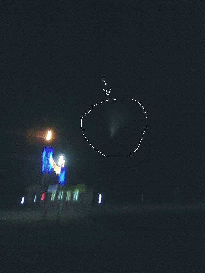 “Сьогодні орієнтовно в 5.30 ранку в небі над Калушем цікавий феномен. Напрям – північний схід. Фото сильно розмите, бо робилось поспіхом. Зліва внизу – ощадбанк на проспекті. У відміченому колі невеличка туманність трикутної форми , у нижній вершині якої яскравий циліндр-світлячок. Через дві-три хвилини світлячок зник а туманність не розвіялась як хмарка, а збільшувалась , зберігаючи трикутну форму. Зазначу, що небо цього ранку чисте і зоряне, без жожних хмар. Що це ? Метеорит?”