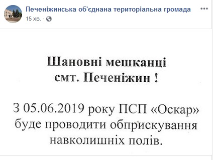 Печеніжинська ОТГ попереджає своїх мешканців про обприскування з 5 червня навколишніх полів.
