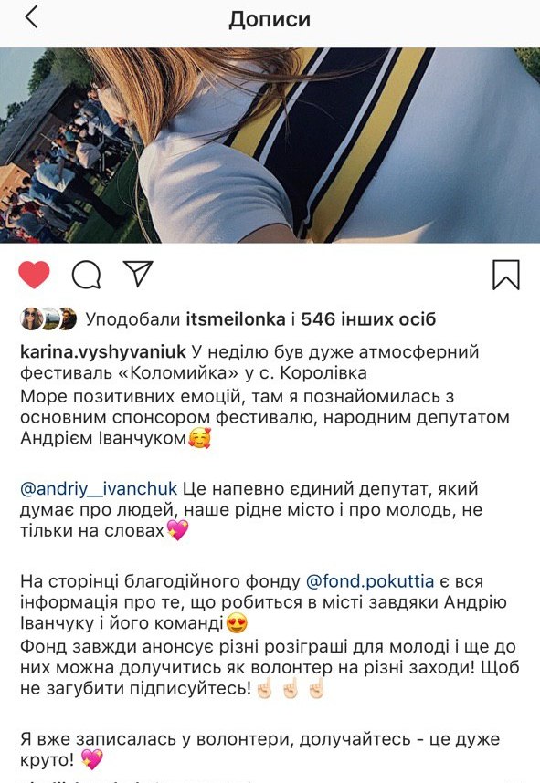 "У неділю був дуже атмосферний фестиваль "Коломийка" у с. Королівка. Там я познайомилася з основним спонсором фестивалю народним депутатом Андрієм Іванчуком", - пише Каріна.