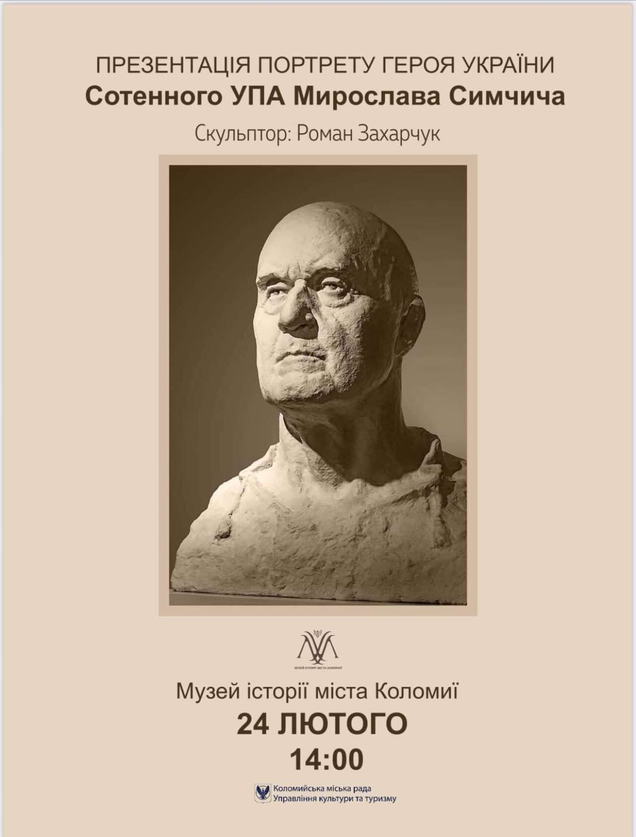 24 лютого о 14:00 Музей історії міста Коломиї запрошує на презентацію портрету Героя України сотенного УПА, почесного громадянина міст Коломиї, Львова, Космача - МИРОСЛАВА СИМЧИЧА «КРИВОНОСА», виконаного заслуженим художником України скульптором - РОМАНОМ ЗАХАРЧУКОМ.