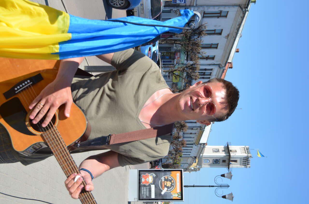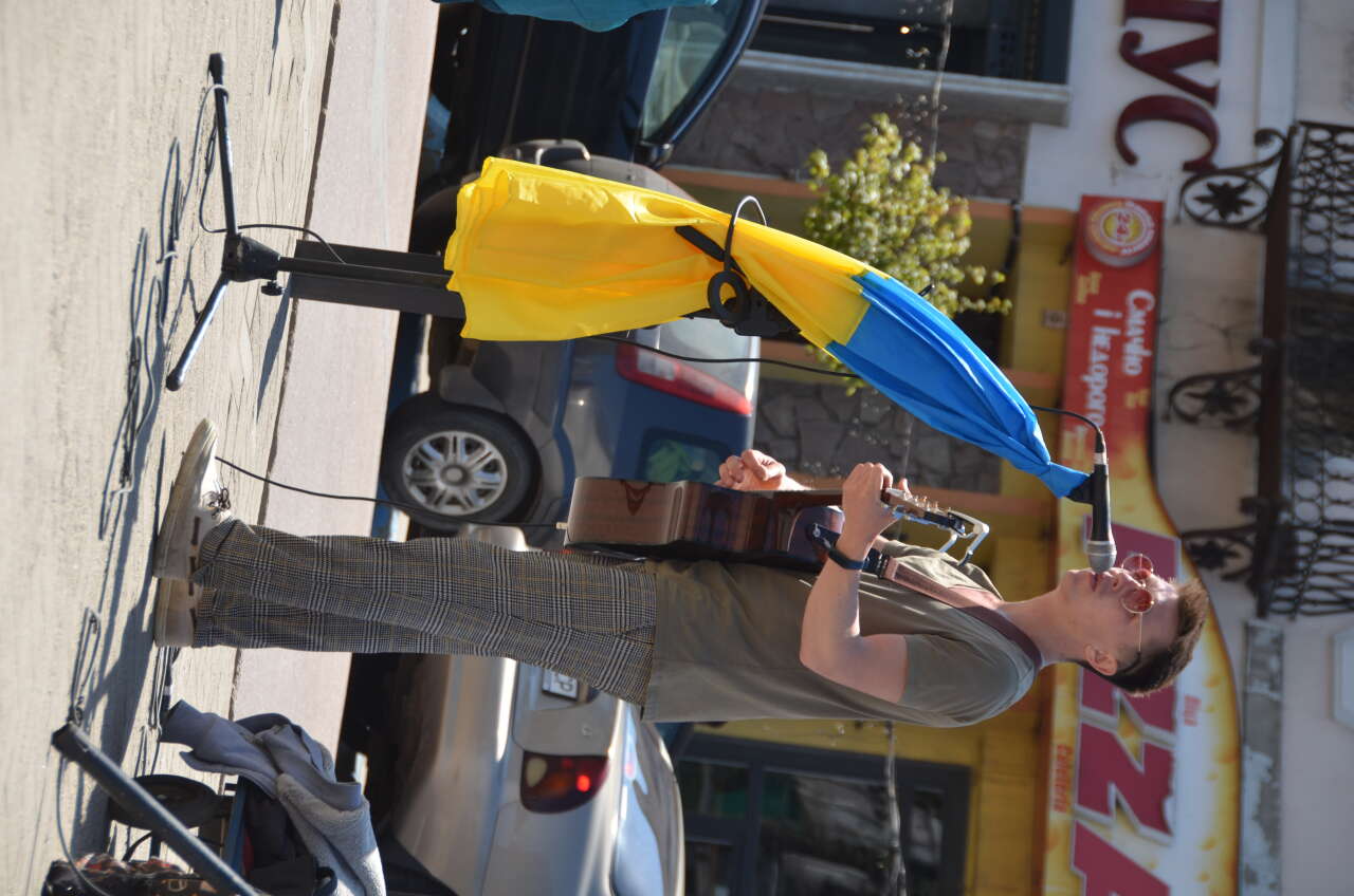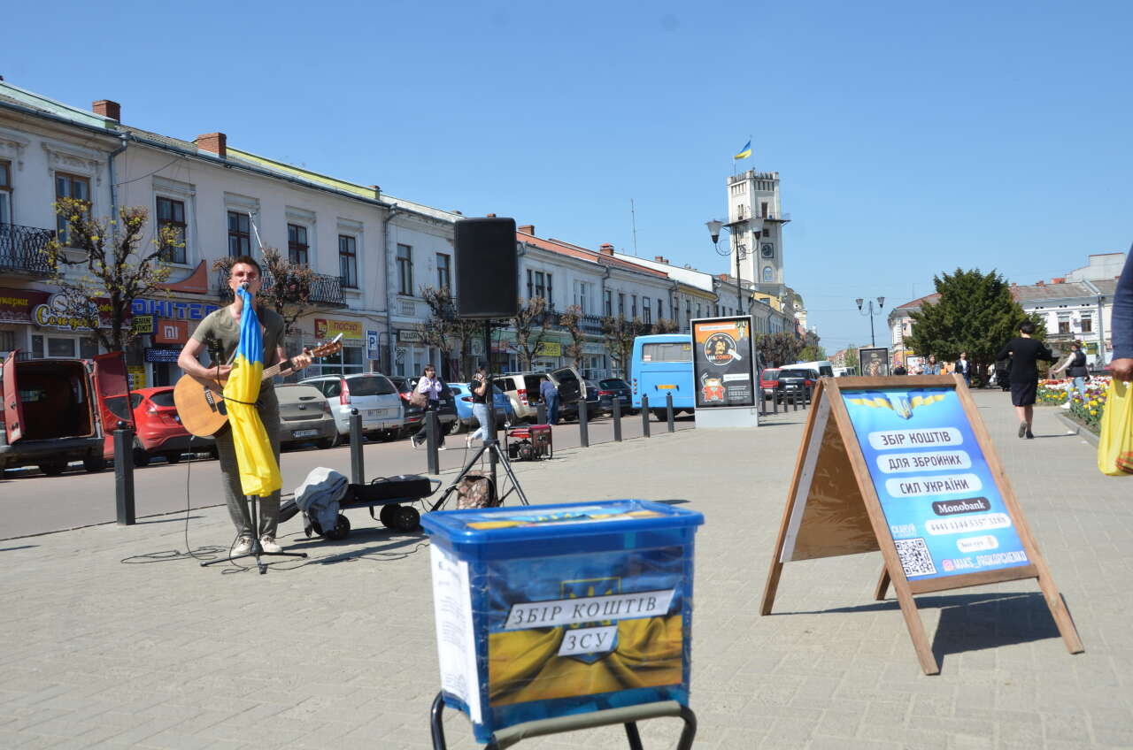 У центрі Коломиї музикант з Рівного організовує благодійні міні-концерти, зібрані кошти передає на потреби ЗСУ. Люди слухають пісні у його виконанні та роблять добровільні внески на знак подяки.