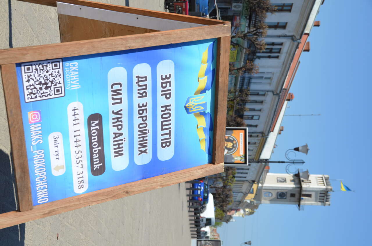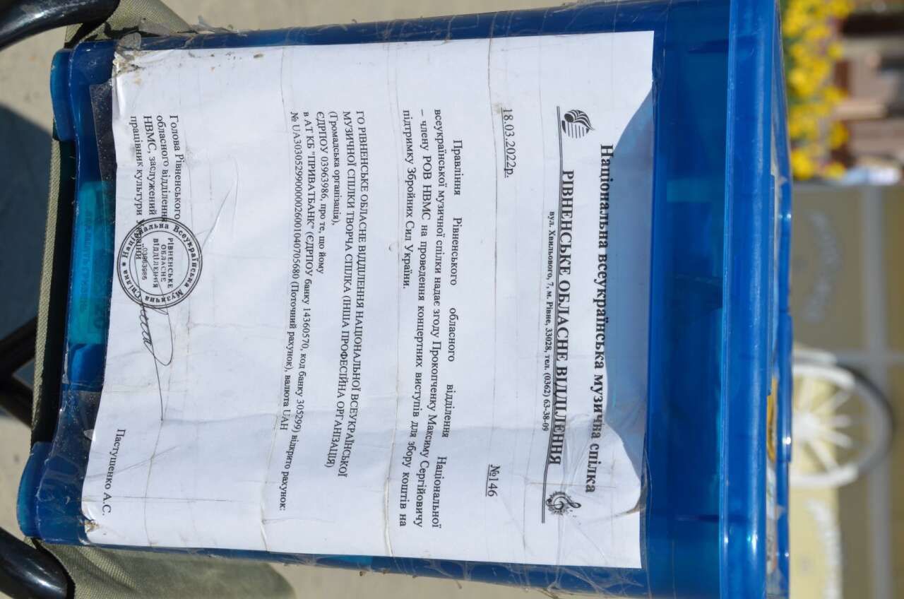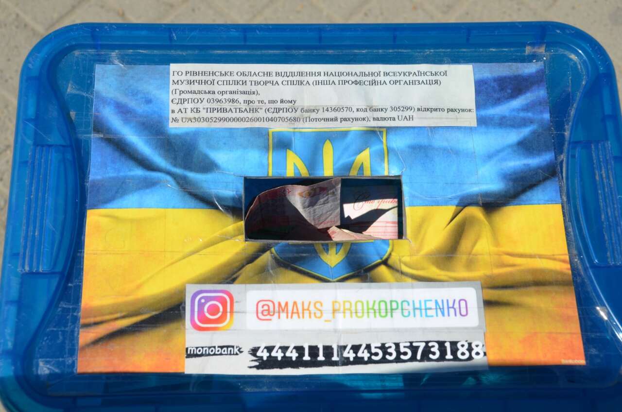 У центрі Коломиї музикант з Рівного організовує благодійні міні-концерти, зібрані кошти передає на потреби ЗСУ. Люди слухають пісні у його виконанні та роблять добровільні внески на знак подяки.