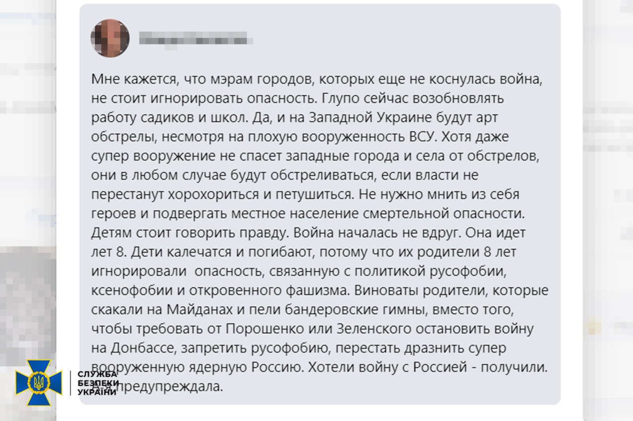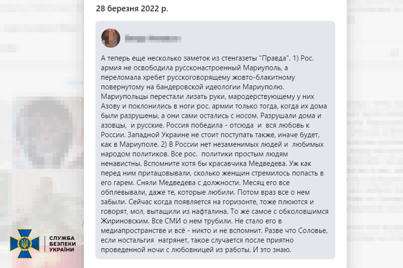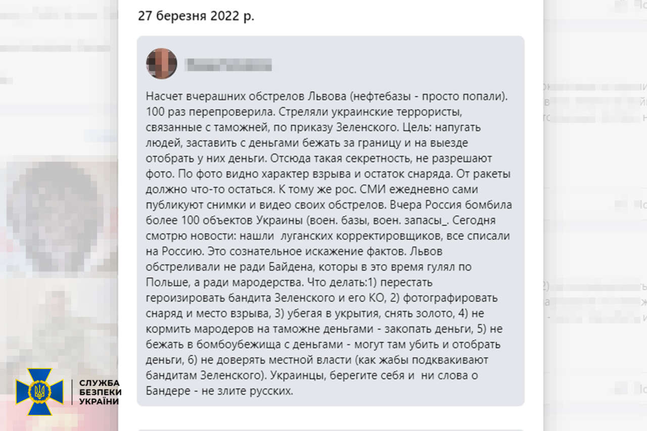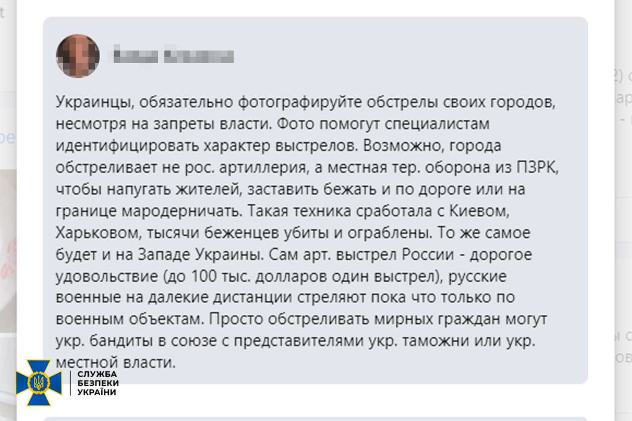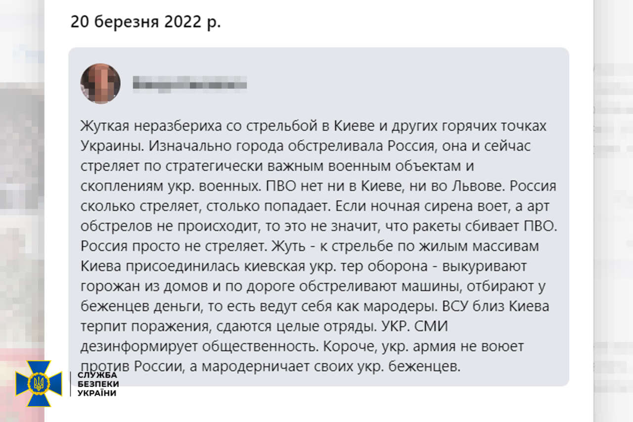 На власній сторінці в Facebook жінка переконувала, нібито цивільні авто, які намагалися евакуюватися з-під Києва, розстрілювали українці, «Азов» мародерствував у Маріуполі, а Київ, Харків та Львів обстрілювала українська тероборона.