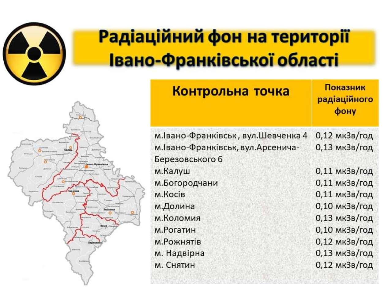 Станом на 6.03.2023 показник радіаційного фону становить від 0,10 мкЗв/год до 0,13 мкЗв/год (що не перевищує природний радіаційний фон для Прикарпаття в межах 0,32 мкЗв/год)