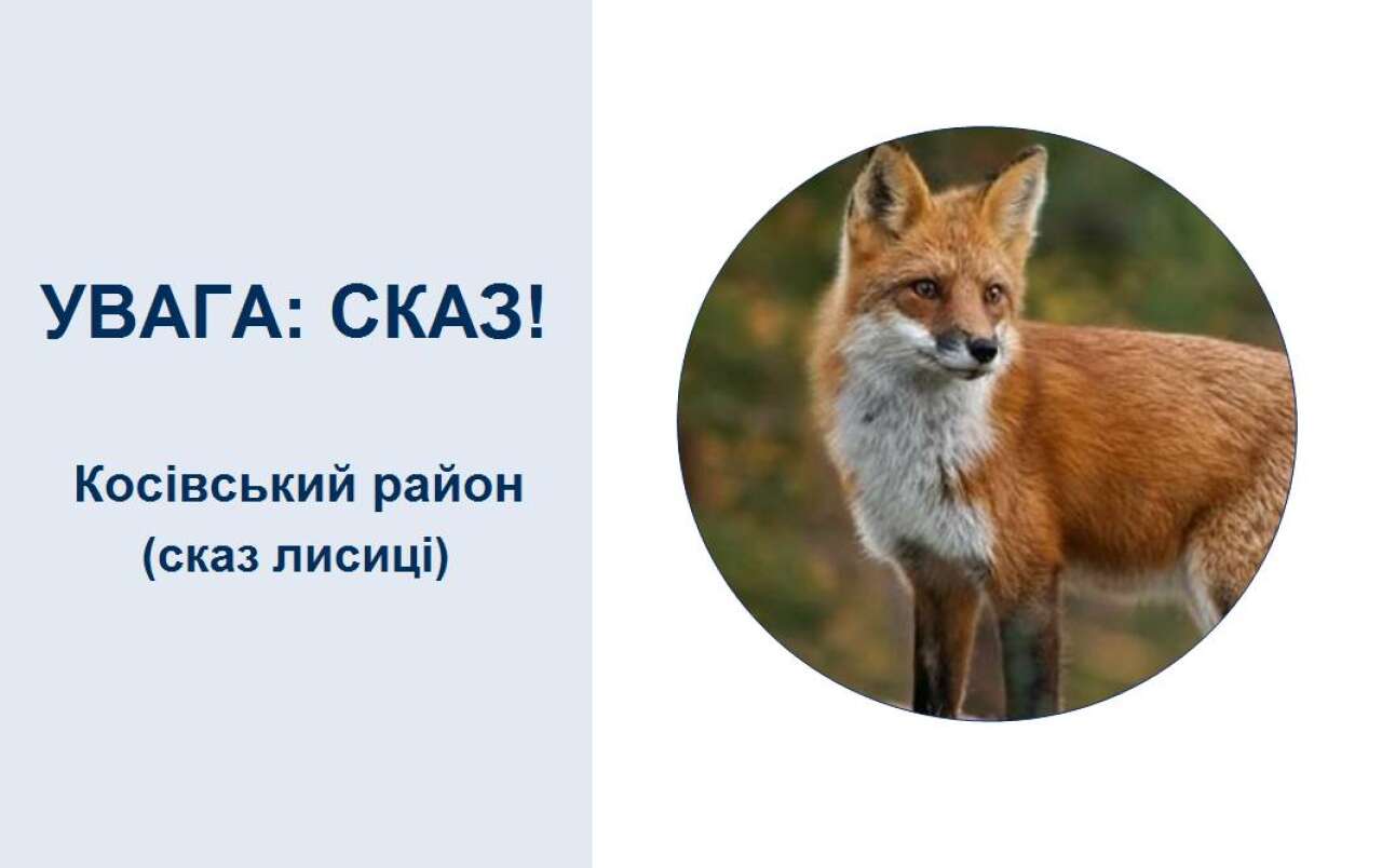 Івано-Франківською регіональною державною лабораторією Держпродспоживслужби встановлено сказ лисиці на території мисливських угідь Філії «Кутське лісове господарство» ДП «Ліси України» (с. Яворів Косівської ОТГ Косівського району Івано-Франківської області).