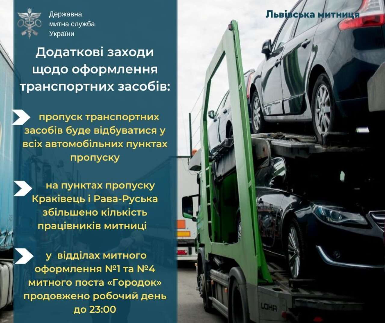 - Внесено зміни в графік роботи митного поста «Городок», де відбувається оформлення та реєстрація транспортних засобів.