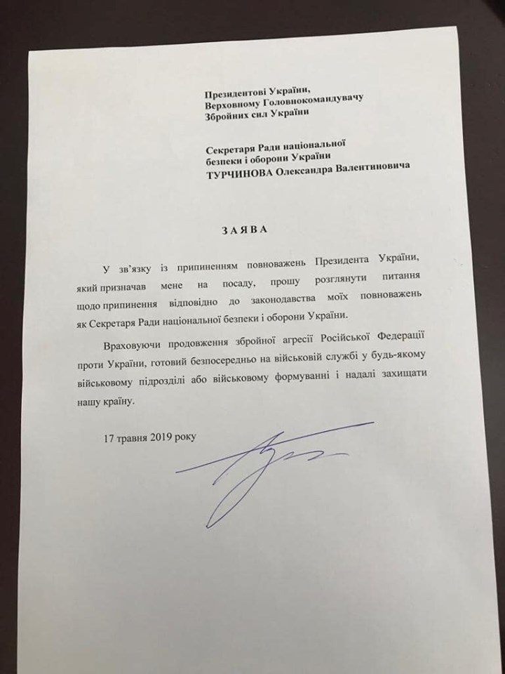 "У зв’язку із припиненням повноважень Президента України, який призначав мене на посаду, прошу розглянути питання щодо припинення відповідно до законодавства моїх повноважень як Секретаря Ради національної безпеки і оборони України. Враховуючи продовження збройної агресії Російської Федерації проти України, готовий безпосередньо на військовій службі у будь-якому військовому підрозділі або військовому формуванні і надалі захищати нашу країну", - йдеться у заяві Турчинова. Турчинов перебував на посаді Секретаря РНБО України з січня 2015 по травень 2019 року, за цей період були зроблені суттєві кроки по зміцненню оборони та безпеки країни.