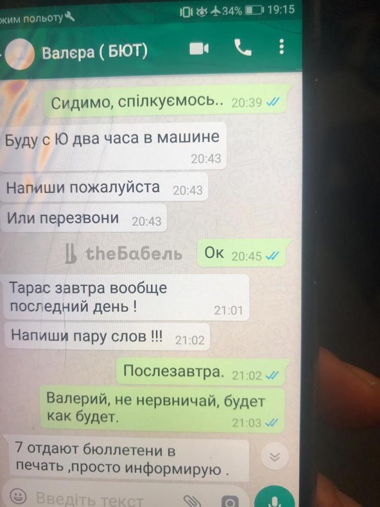 Один з підозрюваних в тиску і спробі дати хабар депутату Юрію Тимошенку — Тарас Костанчук вів смс листування з людиною, яка записана в його телефоні, як "Валєра (БЮТ)". Про це theБабель повідомили джерела в правоохоронних органах. У листуванні, стверджують джерела, Валєра (БЮТ) підганяє Костанчука закінчити якусь справу. Подаємо листування повністю. Костанчук: ... Сидимо, спілкуємось Валєра: Буду з Ю дві години на машині. Напиши будь ласка. або передзвони Костанчук: Ок. Валєра: Тарас, завтра взагалі останній день! Напиши пару слів !!! Костанчук: Післязавтра. Валерій, що не треба нервувати, буде, як буде. Валєра: 7 віддають бюлетені до друку, просто інформую Як повідомляли,  6 березня правоохоронці затримали двох осіб, які намагалися вручити Юрію Тимошенку 5 млн грн за відмову балотуватися в президенти. Затриманим виявився голова "Партії захисників України" Тарас Костанчук та Олександр Іщенко. У свою чергу Юрій Тимошенко наголосив: "Мене не знімуть навіть за великі гроші, я планую вийти в другий тур".