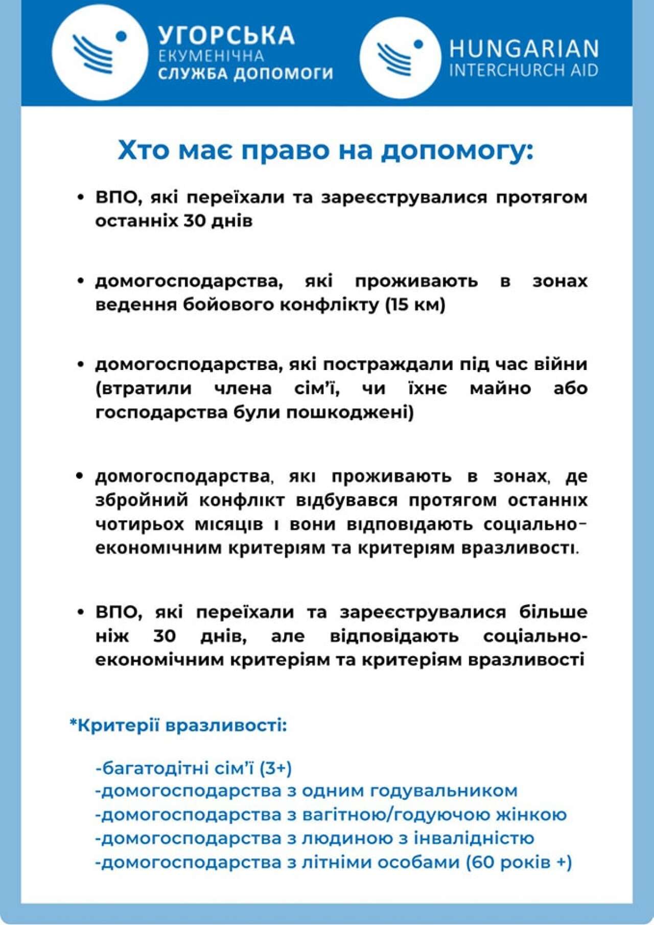 • ВПО, які переїхали та зареєструвалися більше ніж 30 днів, але відповідають соціально економічним критеріям та критеріям вразливості.