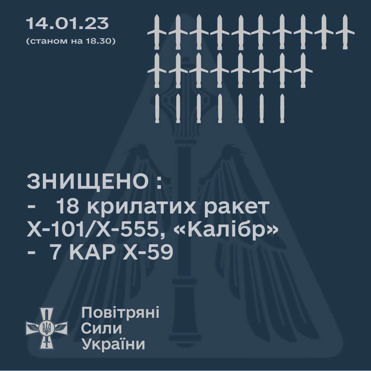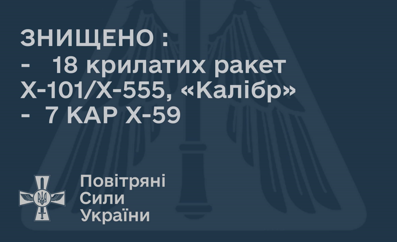Тож загалом на цей час знищено 25 із 38 ракет різних типів. Зокрема 18 крилатих ракет повітряного та морського базування Х-101/Х-555 та «Калібр», сім керованих авіаційних ракет Х-59.