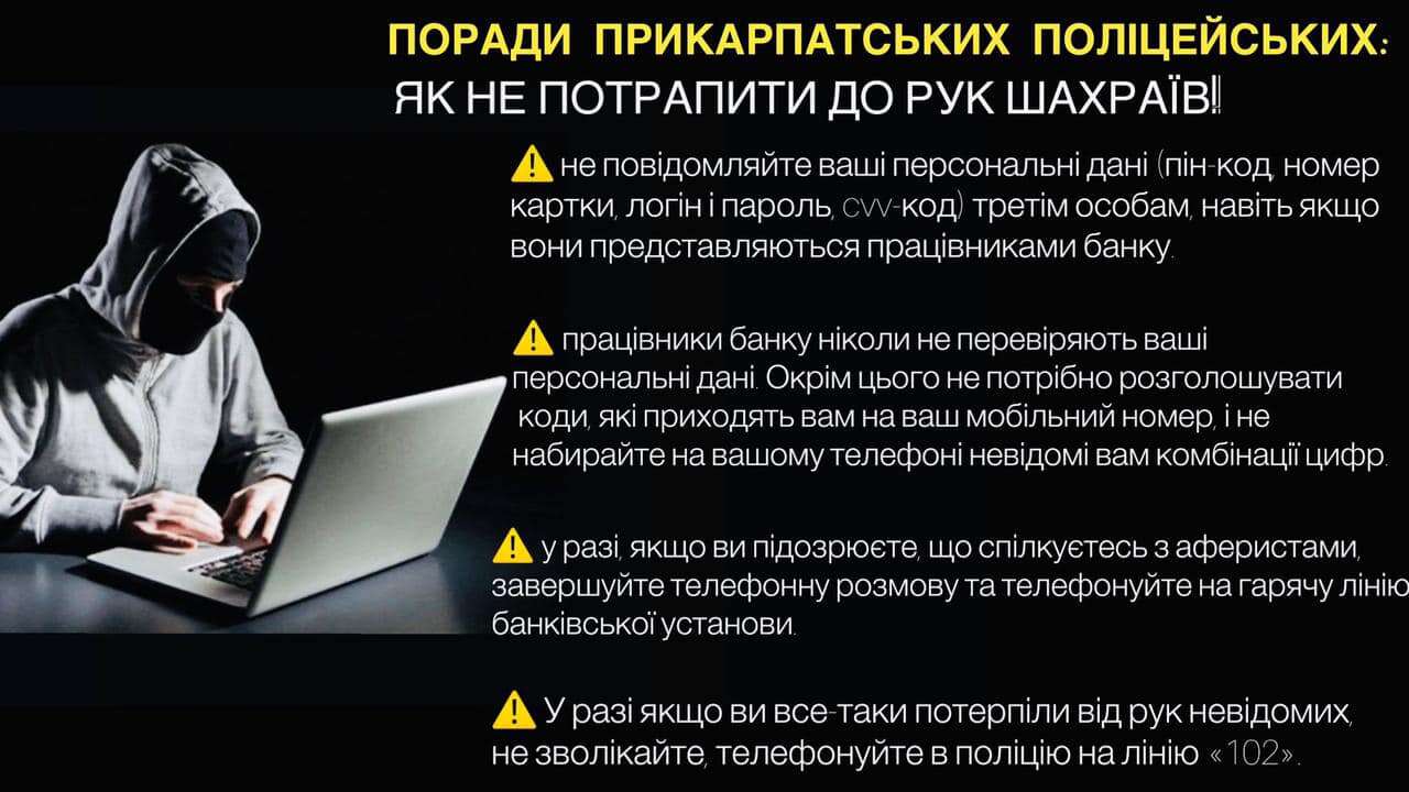10 квітня до Івано-Франківського районного управління поліції звернувся 26-річний місцевий мешканець і повідомив про те, що через неправомірні дії шахраїв втратив 50 тисяч гривень. Як з’ясували слідчі, заявник через інтернет замовив мобільний телефон та надіслав оплату за товар. Після чого зв’язок із псевдопродавцем обірвався. Зрозумівши обман, чоловік одразу звернувся до поліції.