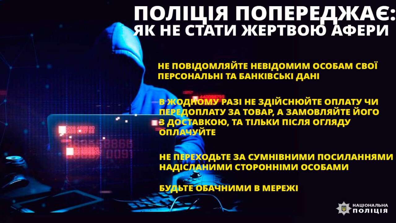 Поліцейські вкотре наголошують, не замовляйте товар у неперевірених продавців, оплату здійснюйте лише після отримання та перевірки бажаного майна. Не повідомляйте дані банківських карток незнайомцям.