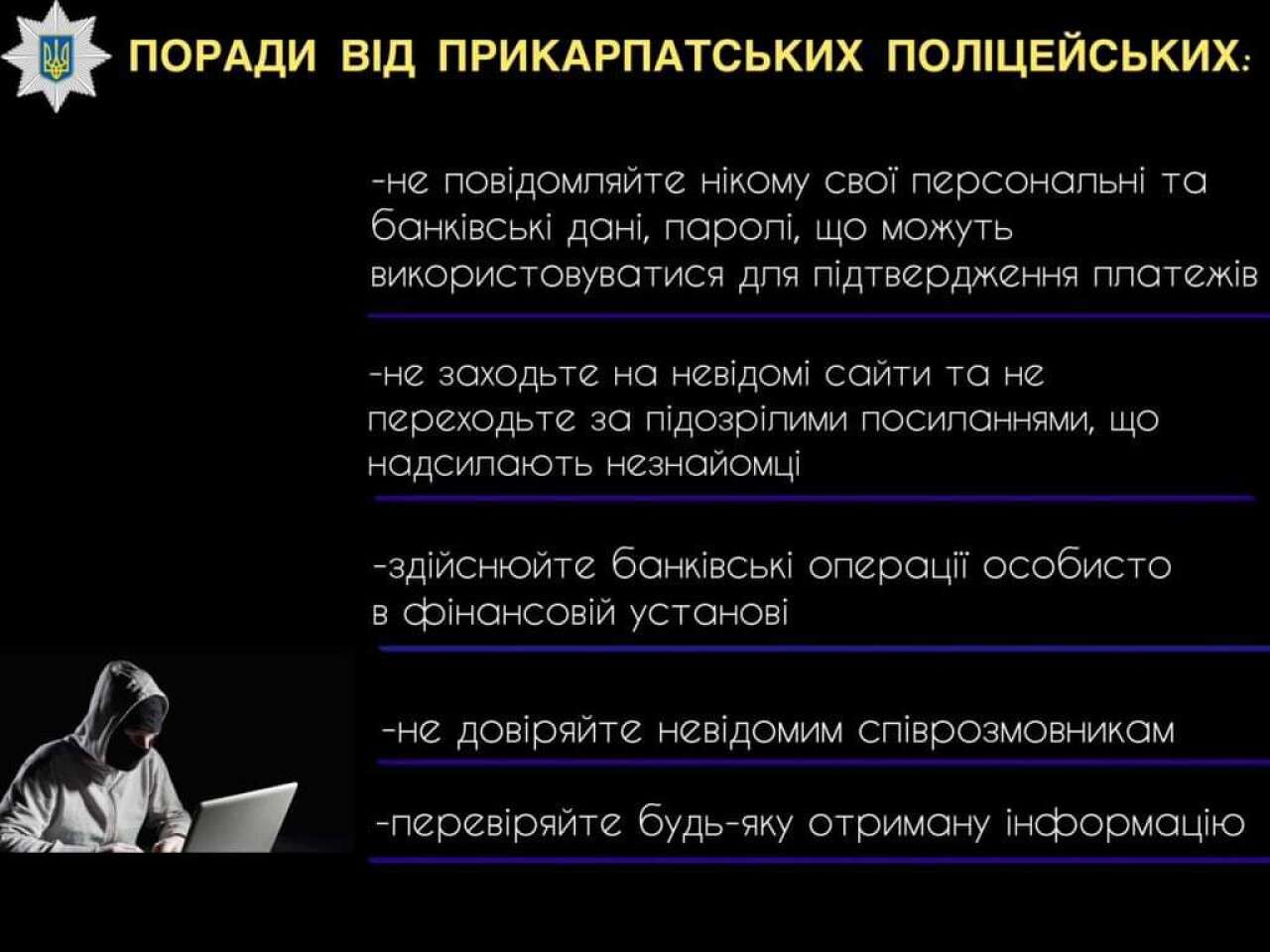 20 лютого до верховинських поліцейських звернувся 34-річний місцевий мешканець. Чоловік повідомив, що його ошукали телефонні шахраї. Як вдалося з’ясували правоохоронцям, напередодні до чоловіка зателефонувала невідома особа, яка представилась працівником банку. Незнайомець повідомив, що з рахунку заявника шахраї хочуть списати кошти. А щоби цього уникнути потрібно назвати код із смс-повідомлення. Довірливий чоловік виконав всі вказівки невідомої особи. Невдовзі з його зарплатної карти аферисти зняли понад 52 тисячі гривень, а з кредитної - понад 56 тисяч.