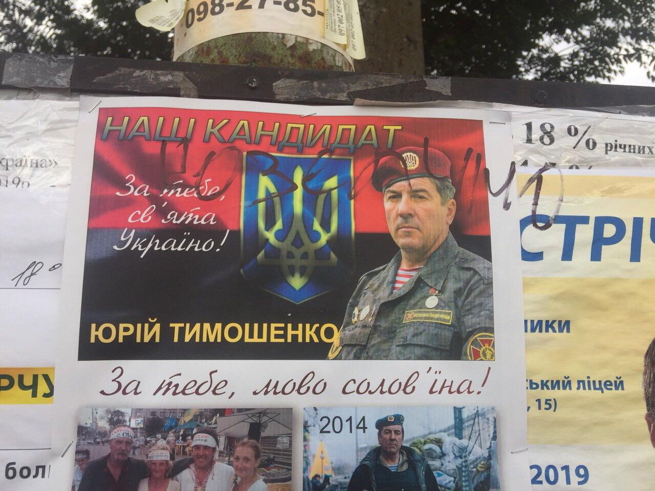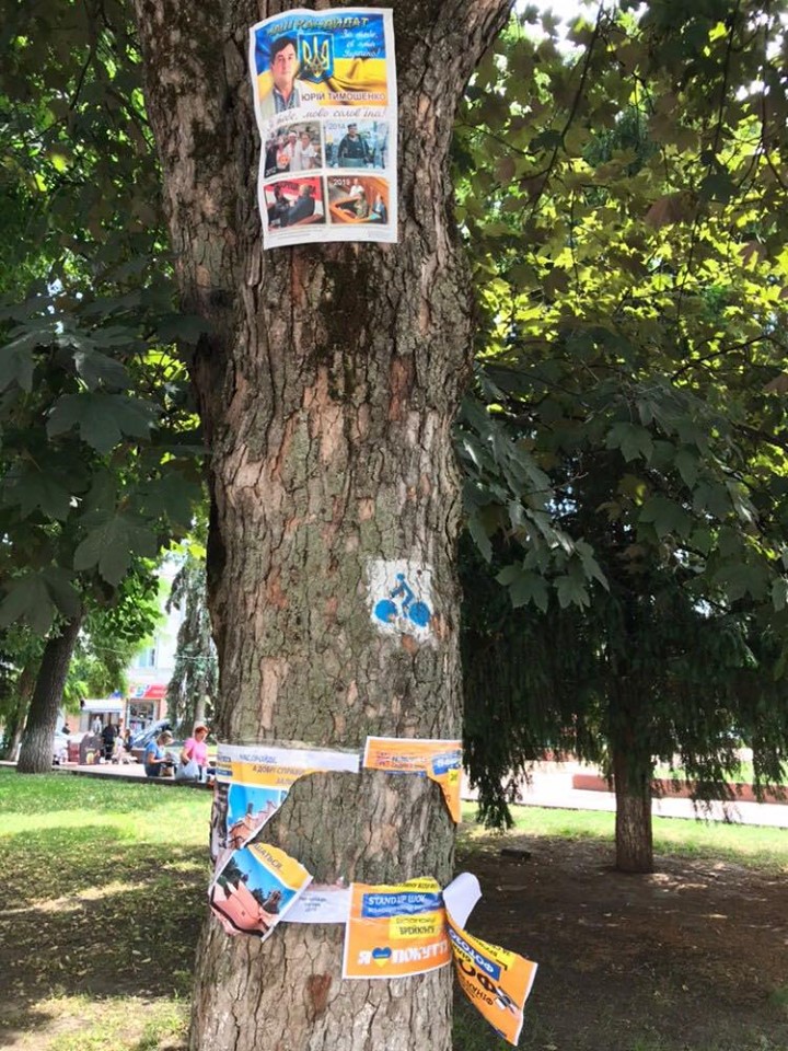 Чимало реклами й у діючого народного депутата Юрія Тимошенка, який чомусь вивішує агітаційні листівки дуже високо на деревах. Щоб не пошкодили чи для пернатих?