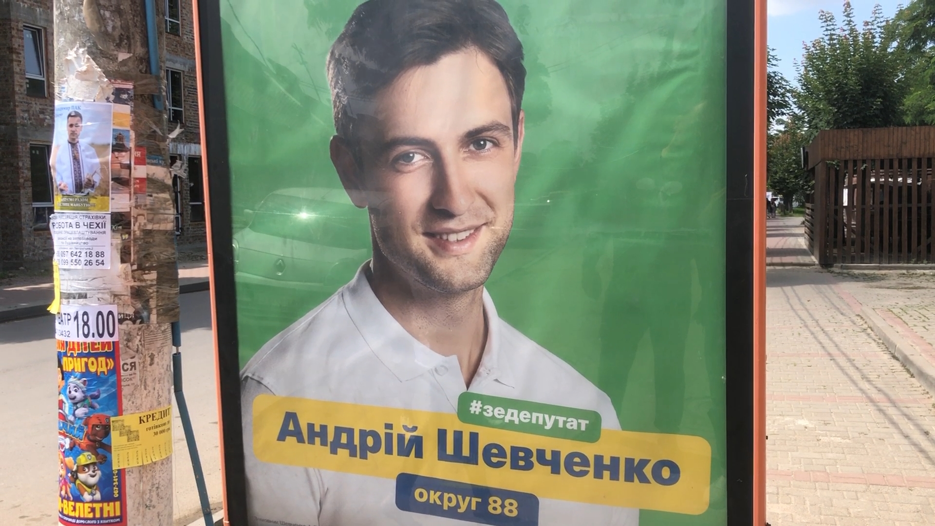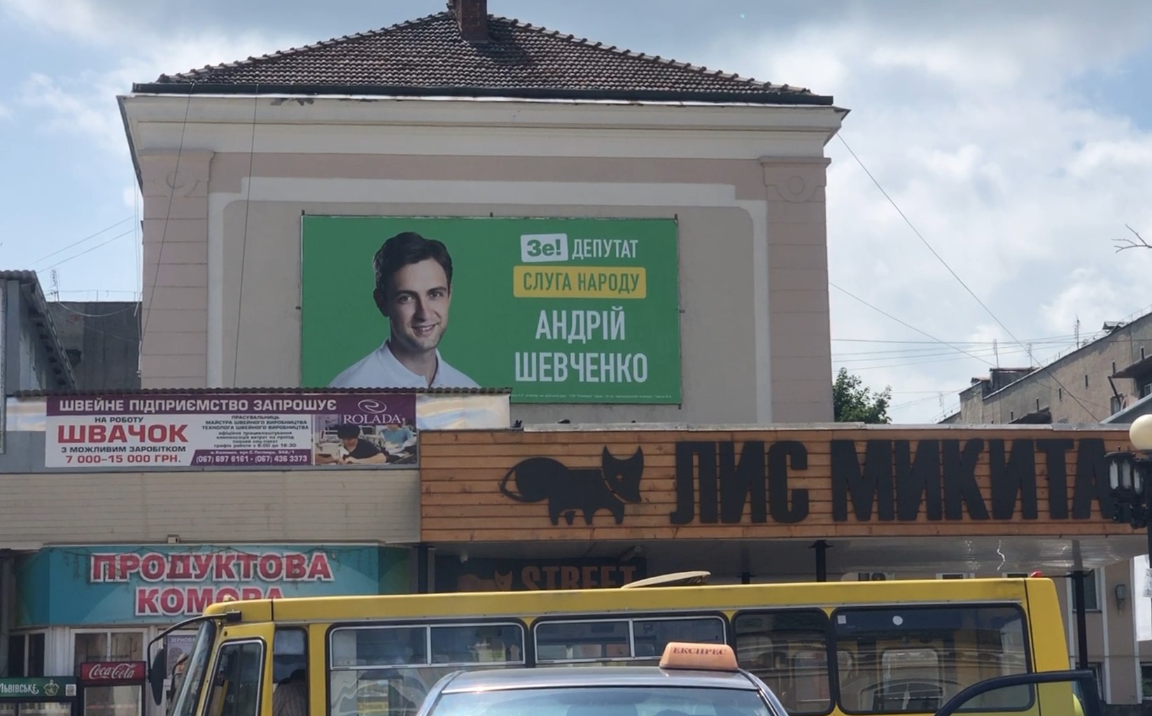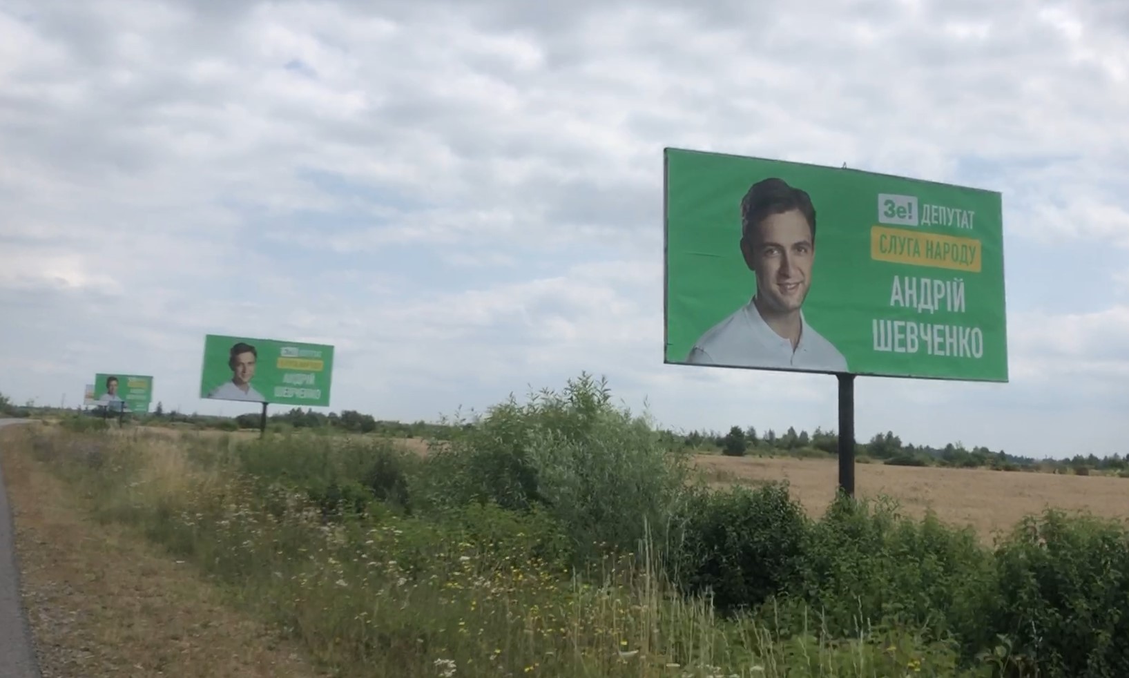 Та все ж лідером з кількості агітаційних бордів та сітілайтів на 88 окрузі залишається 27-річний кандидат від "Слуги народу", рідний брат власників "Буковелю" Олександра та Віктора Шевченків, бізнес-партнерів олігарха Коломойського, - Андрій Шевченко.