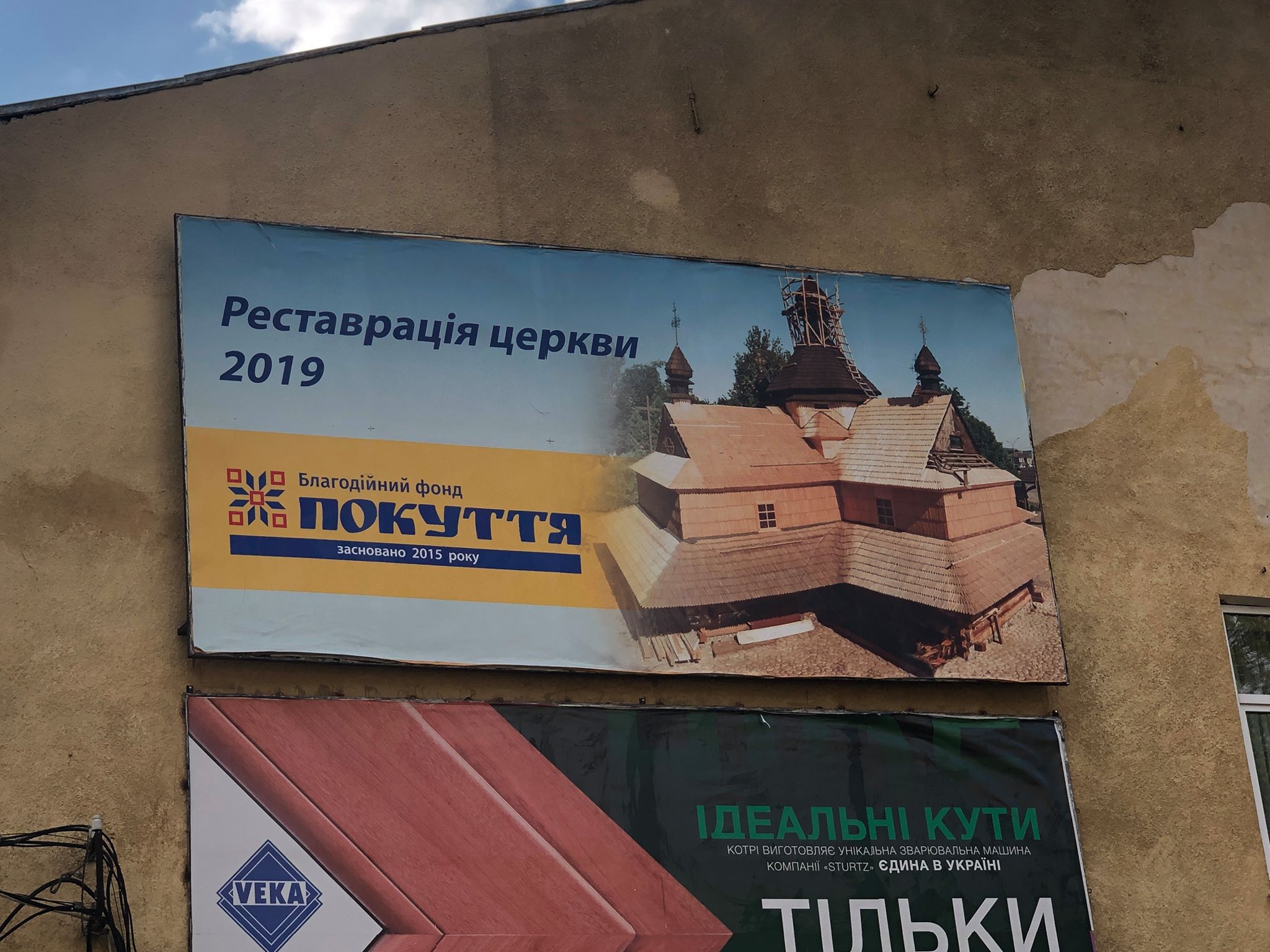 На бордах Андрій Іванчук звітує про конкретні справи - масштабні проекти, втілені за останні 5 років, - це будівництво дзвіниці, реставрація церкви Благовіщення, будівництво фонтана.