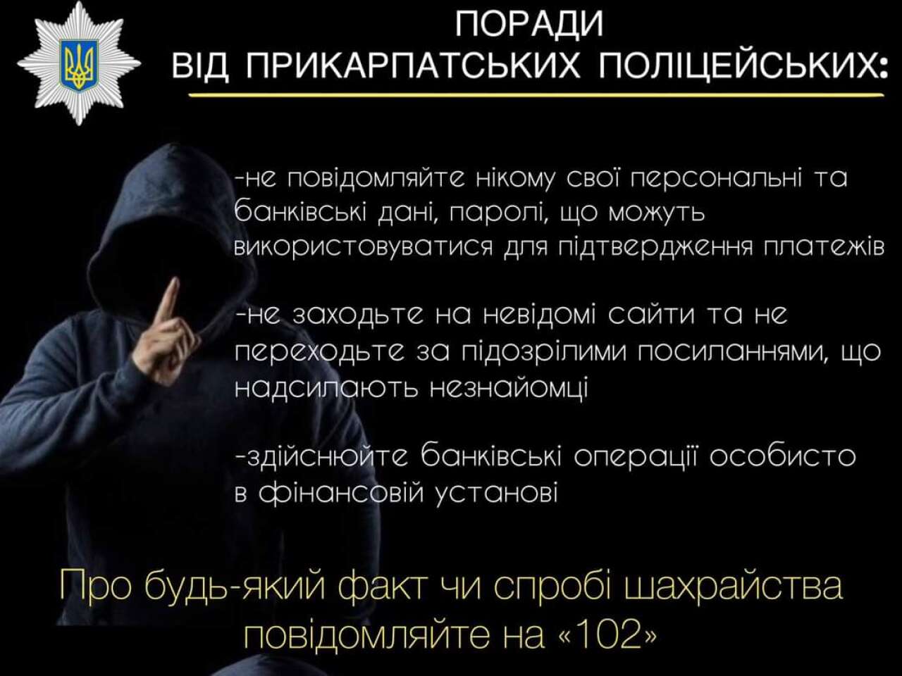 За допомогою до косівських поліцейських звернувся мешканець району. Чоловік пояснив, що на одному із сайтів виставив оголошення про продаж дитячого столика. До потерпілого подзвонив невідомий та повідомив, що хоче придбати товар, згодом домовився про перерахування грошей. Для отримання коштів чоловіку необхідно було перейти за посиланням для оформлення доставки та вказати реквізити банківської карти. Виконавши всі умови з рахунків потерпілого було списані 43 тисячі гривень.